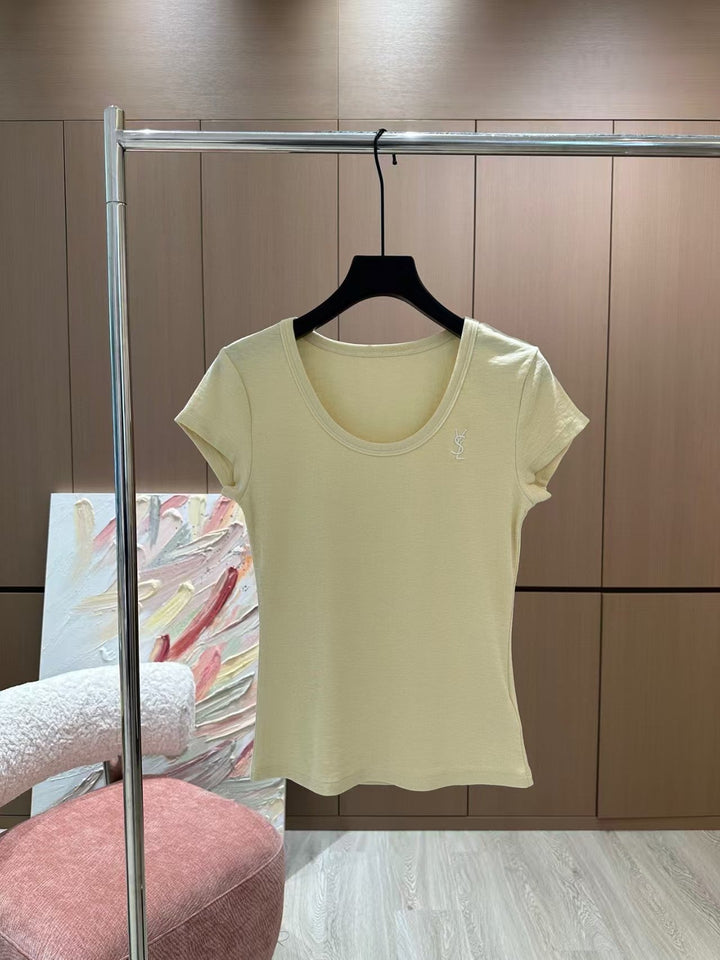 25 Neues Kurzarm-T-Shirt mit Stickerei in Kontrastfarbe