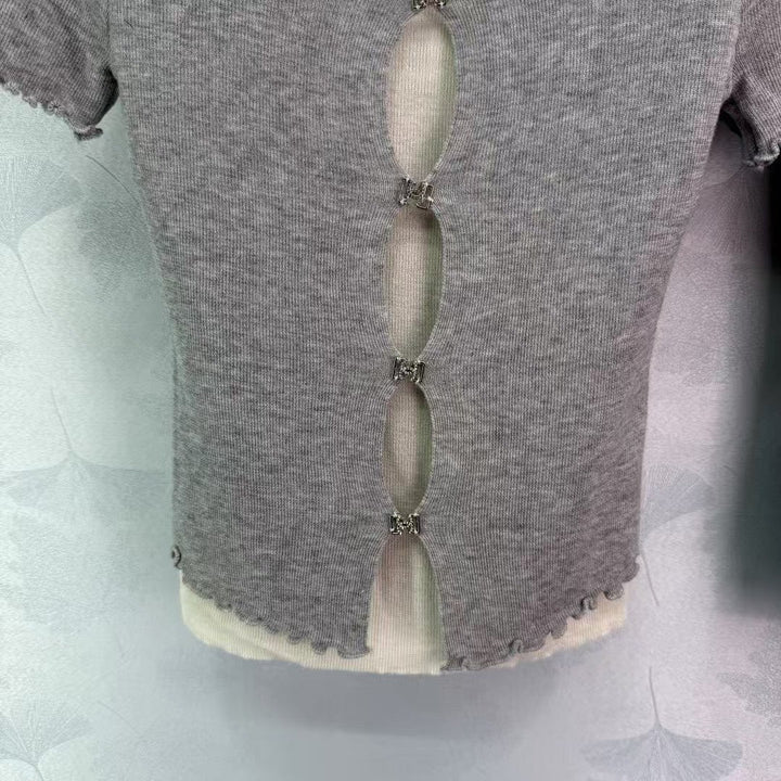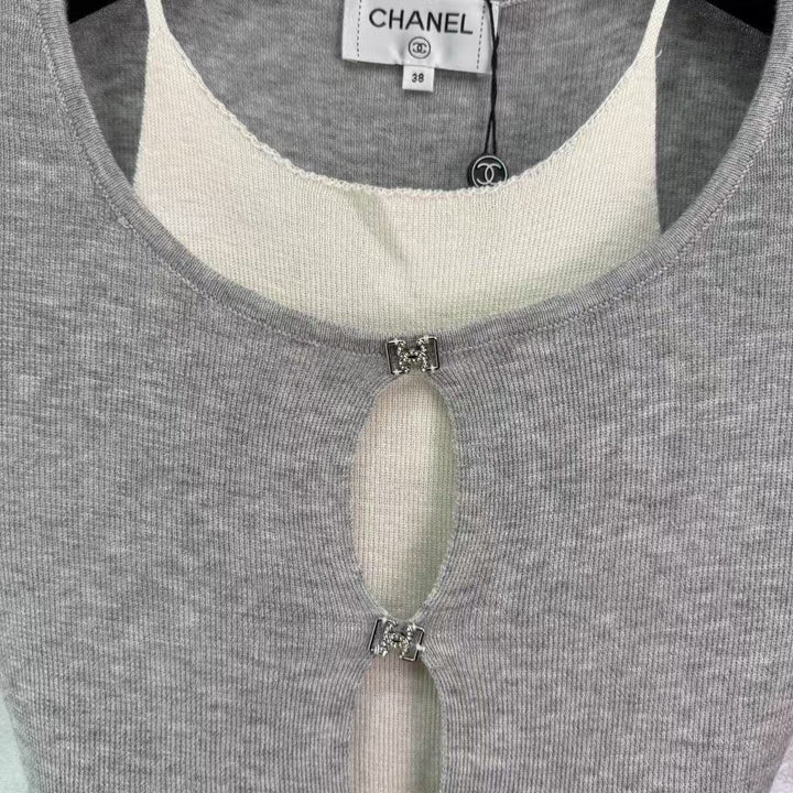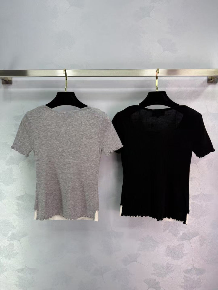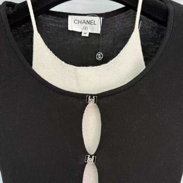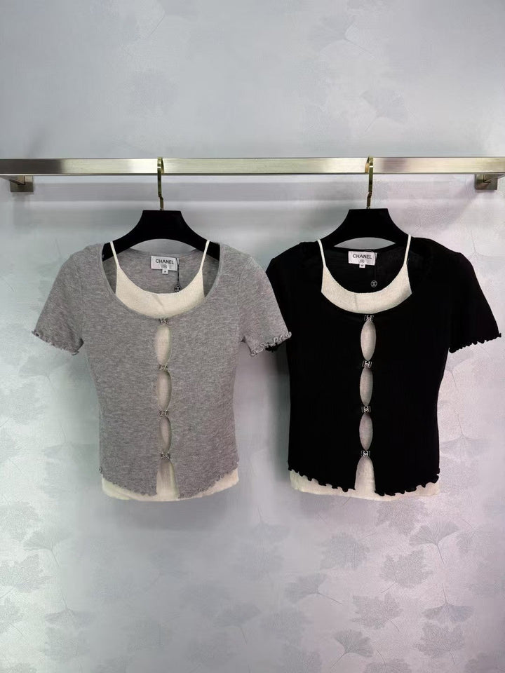 Der zweiteilige Fake-Hohlstrick mit kurzen Ärmeln besteht aus speziellem YB-Wollgarn. Die Textur ist hochwertig und bequem. Das kurzärmlige Strickoberteil mit Rundhalsausschnitt ist tailliert. Das dünne Unterhemd innen bildet die Basisschicht, während die äußere kurzärmlige Vorderseite mit porösen, hohlen Doppel-Cs verziert ist. Bündchen und Säume sind mit Spitze umrandet. Der Fake-Zweiteiler im Millennial-High-Street-Stil wirkt eleganter mit kontrastierenden Farben innen und außen. Die Strassschnalle mit Doppel-C-Schnalle unterstreicht die Markenpersönlichkeit und den hochwertigen Tragekomfort. Die Elastizität verleiht ihm einen exquisiten Look. Das Tragen lässt Sie schlanker aussehen und verleiht Ihnen einen entspannten Ton. Leichter Luxus und modisches Temperament. Es kann allein oder in mehreren Lagen getragen werden. Die erste Wahl für modische Kleidung zu jeder Jahreszeit.