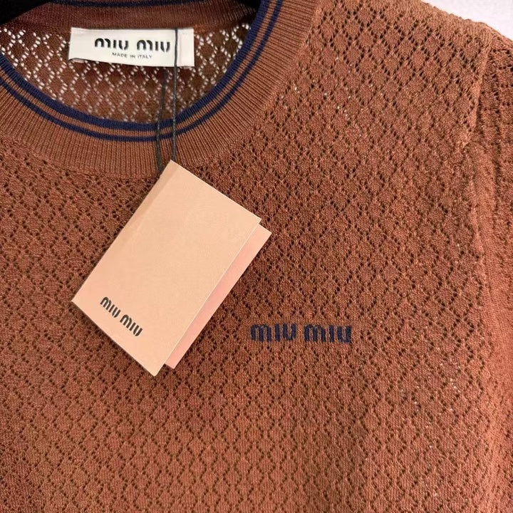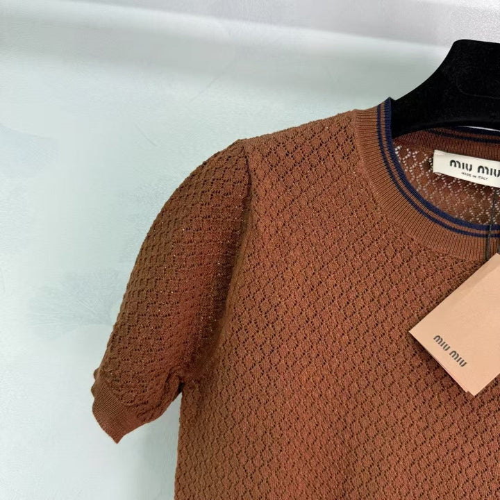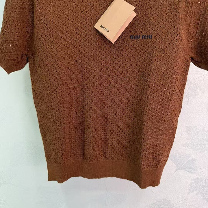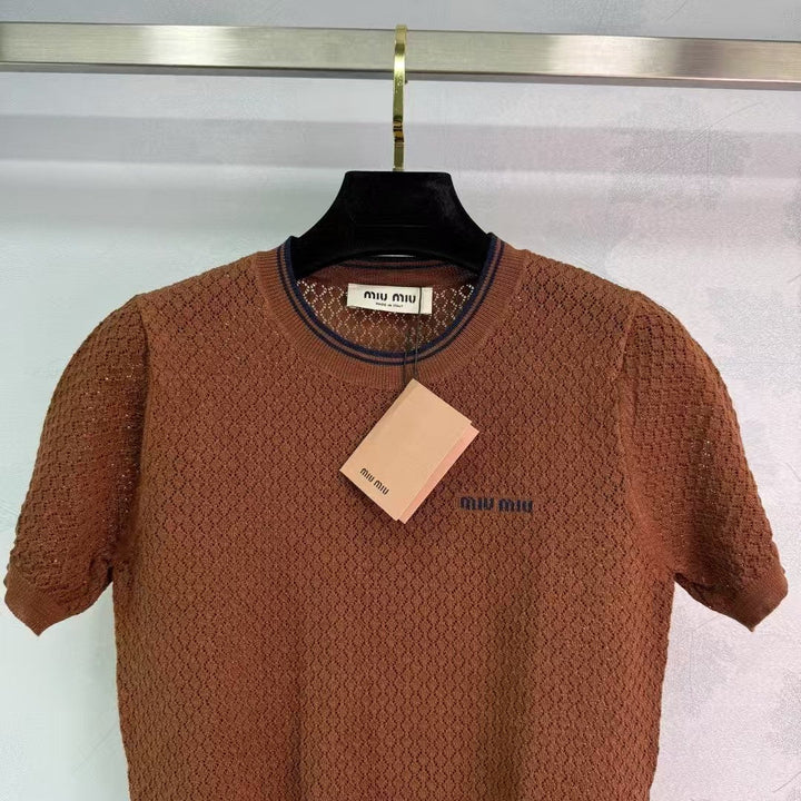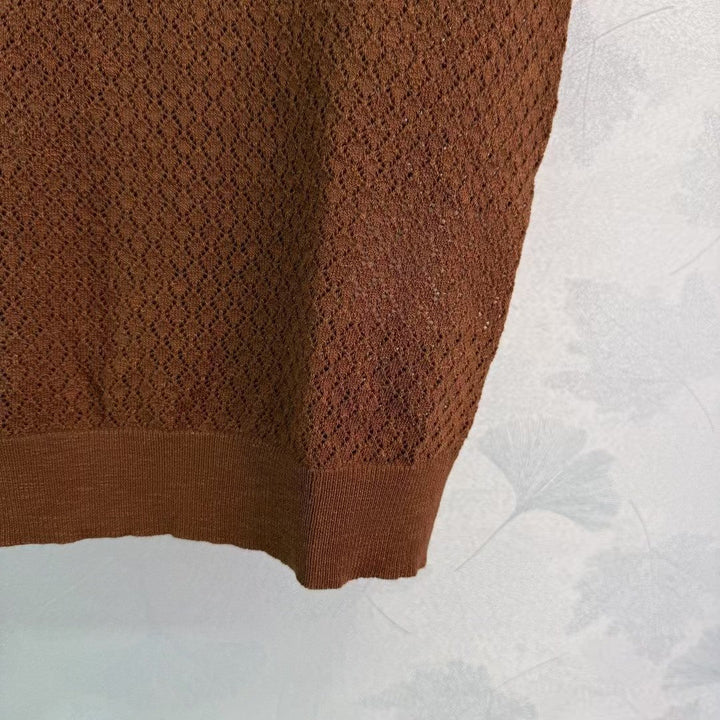 2025 neue Produkte in den Regalen Hohl gestrickter Rundhalsausschnitt mit kurzen Ärmeln Individuelle Webung aus YB-Seiden- und Leinengarn Hochwertige Textur Glanz und bequem Gestrickter Rundhalsausschnitt mit kurzen Ärmeln Der gesamte Körper ist mit hohler Häkeltextur durchwirkt Das Wellenrautenmuster unterstreicht das hochwertige Tragegefühl Die Streifenkontur am Ausschnitt + Bündchen und Saum bestehen aus eingefädelter Spitze Die Elastizität macht es noch exquisiter Das Tragen schlank Die Version umfasst den Körper und zeigt den entspannten Ton Das kontrastfarbene gestickte Logo auf der Brust unterstreicht den leichten Luxus und das modische Temperament Kann allein oder übereinander getragen werden Die erste Wahl für modische Kleidung zu jeder Jahreszeit