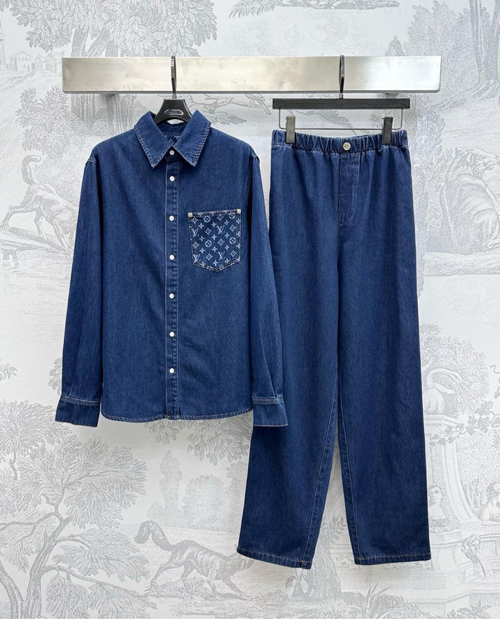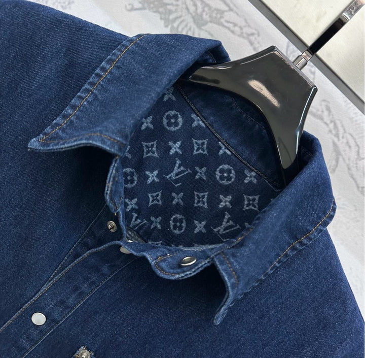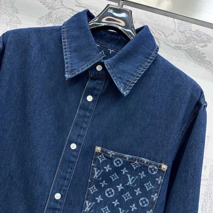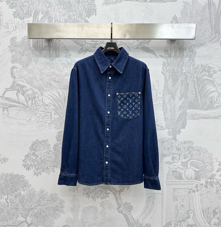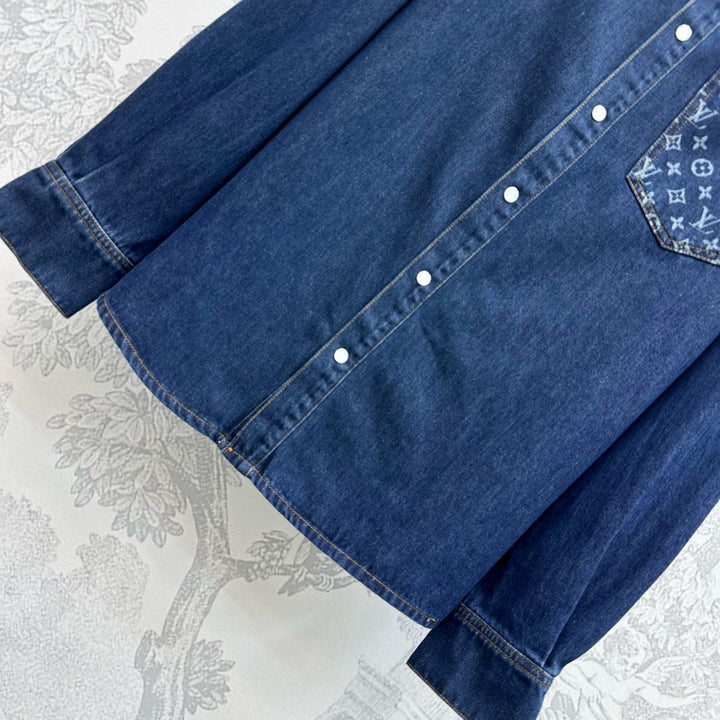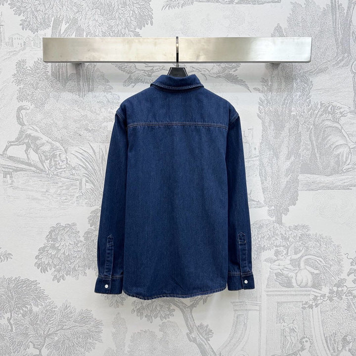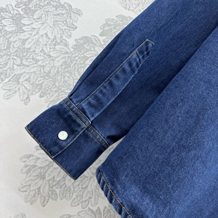 Neuheiten 25: Jacquard-Jeanshemd mit Taschen. Maßgefertigter YB-Import-Twill-Baumwoll-Denim für einen edlen, strukturierten Look. In Vintage-Dunkelblau gewaschen. Der lockere, gerade Schnitt schmeichelt der Figur und zeigt das markentypische Jacquard-Logo mit dem vierblättrigen Kleeblatt auf den Taschen, das den unverkennbaren Stil der Marke unterstreicht. Weiße Steppnähte und eine verstellbare Knopfleiste mit Druckknöpfen sorgen für einen Lagenlook. Schlicht und raffiniert, mit Reverskragen. Kombinieren Sie es mit dem gleichen Haremskordelzug für einen stylischen und stilvollen Look. Auch separat erhältlich.