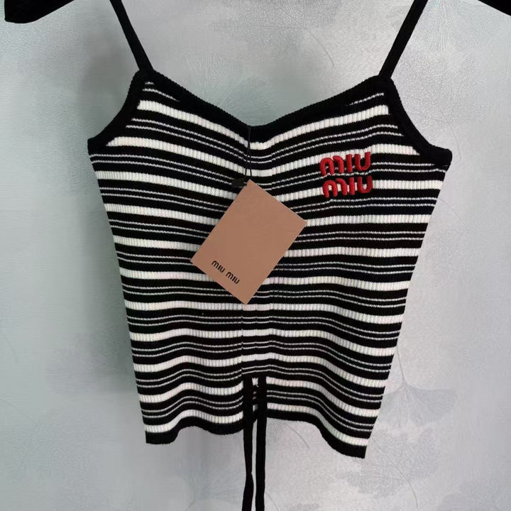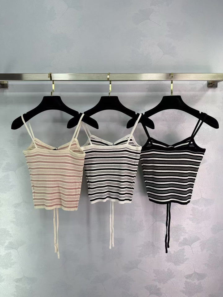 2025 neue Produkte in den Regalen Gestricktes, gestreiftes Camisole mit Kordelzug, individuell gewebt aus YB-Wollgarn. Hautfreundlich und bequem. Elastisch und leicht zu tragen. Camisole-Stil. Durchgehend eingewebte Streifen. Das schmale Camisole betont die anmutigen Schulterlinien. Die Mitte der Brust, die sich bis zum Saum erstreckt, ist mit einer Spitzenschleife und einem Buchstabenlogo verziert. Dezent und exquisit. Verleiht der Form ein Gefühl von Schichten. Sexy und charmant. Vielseitiger und schlankmachender Stil. Die erste Wahl für Sommermode.
