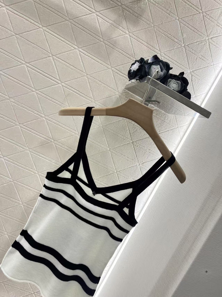 Neuheiten 2025. Gestreifte, perlenbesetzte Strickweste aus speziellem YB-Wollgarn. Weich und hautfreundlich. Bequem und stylisch. Camisole-Schnitt. Der Ausschnitt ist angemessen freigelegt. Verschönert das Kopf-Schulter-Verhältnis und lässt Sie schlanker aussehen. Streifen sind auf Brust und Saum verteilt. Die unregelmäßige Anordnung bereichert das Gefühl der Schichtung. Dreidimensionale Logoverzierung aus Perlenpailletten auf der Brust. Starker Retro-Stil. Die schmale Passform betont die Figur. Modisch und modisch.