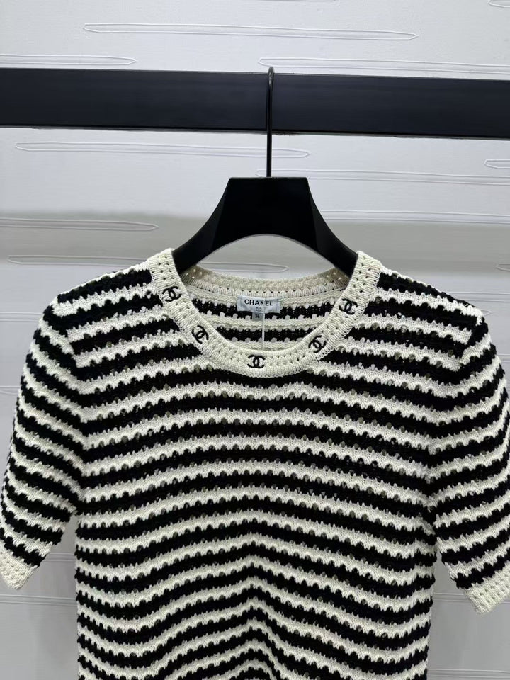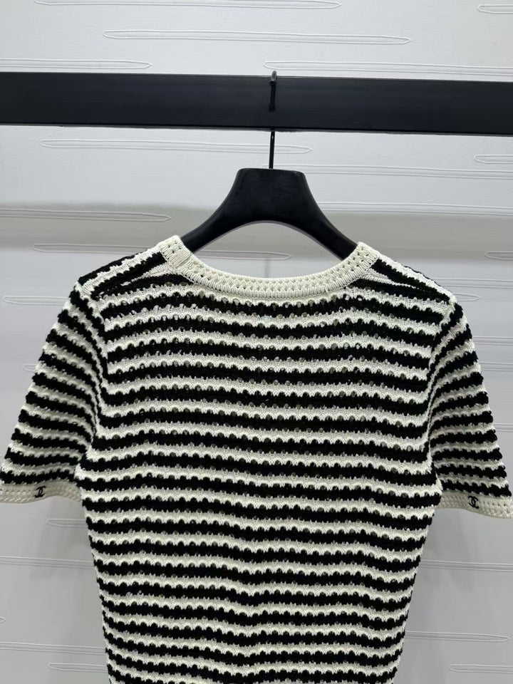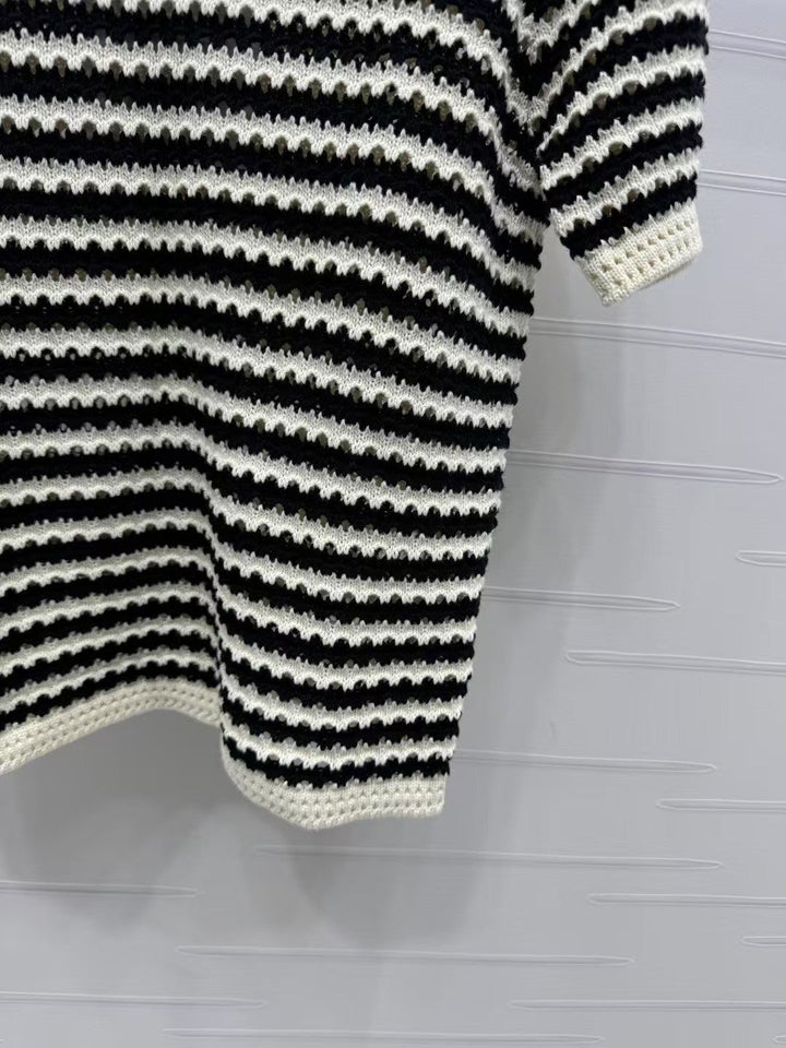 Die neueste Kollektion für Frühling und Sommer 2025! Gestreifte, gestrickte Kurzarm-Strickjacke! Die kontrastierenden Streifen am ganzen Körper mit hohler Häkelarbeit wirken verspielt und verjüngend. Das gestickte Doppel-C am Ausschnitt zeigt den eleganten französischen Kleidungsstil. Ein auffälliges Outfit für alltägliche Verabredungen!