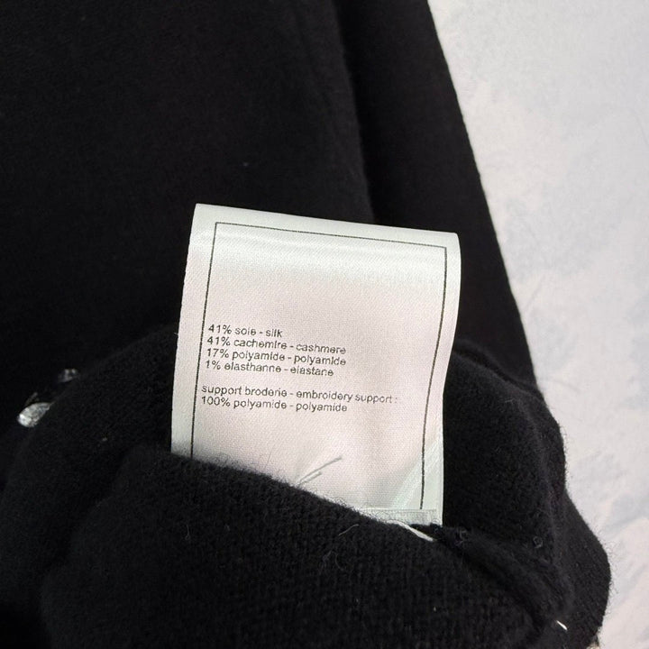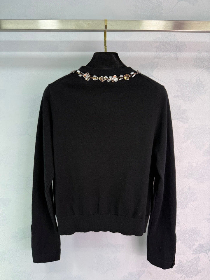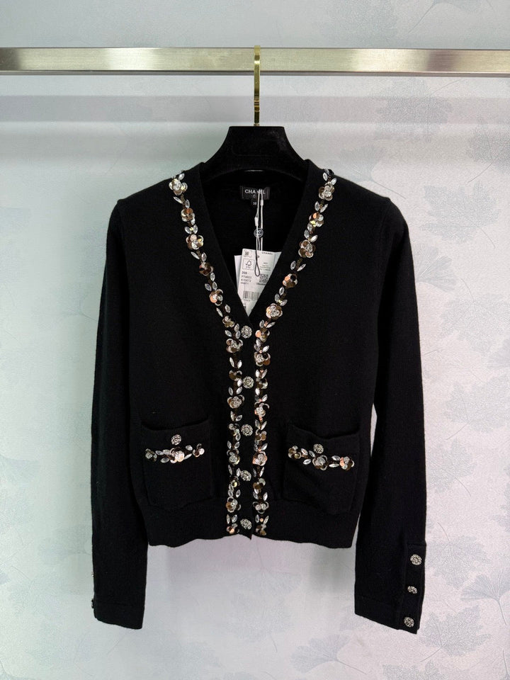 New arrivals: Beaded flower knitted cardigan. Customized YB silk-wool yarn, fine-density knitting, clear wool texture, comfortable and skin-friendly. V-neck dropped shoulder cardigan cut. Diamond-embroidered round buttons, heavy and gorgeous, create a lazy and relaxed feeling. The collar, cuffs and hem are ribbed with elasticity. The front cuffs and pockets are decorated with beaded sequin flowers with embroidery. The positioning is staggered. The black and gold color scheme enriches the design with a sense of layering. The version is inclusive of body shapes and fashionable.