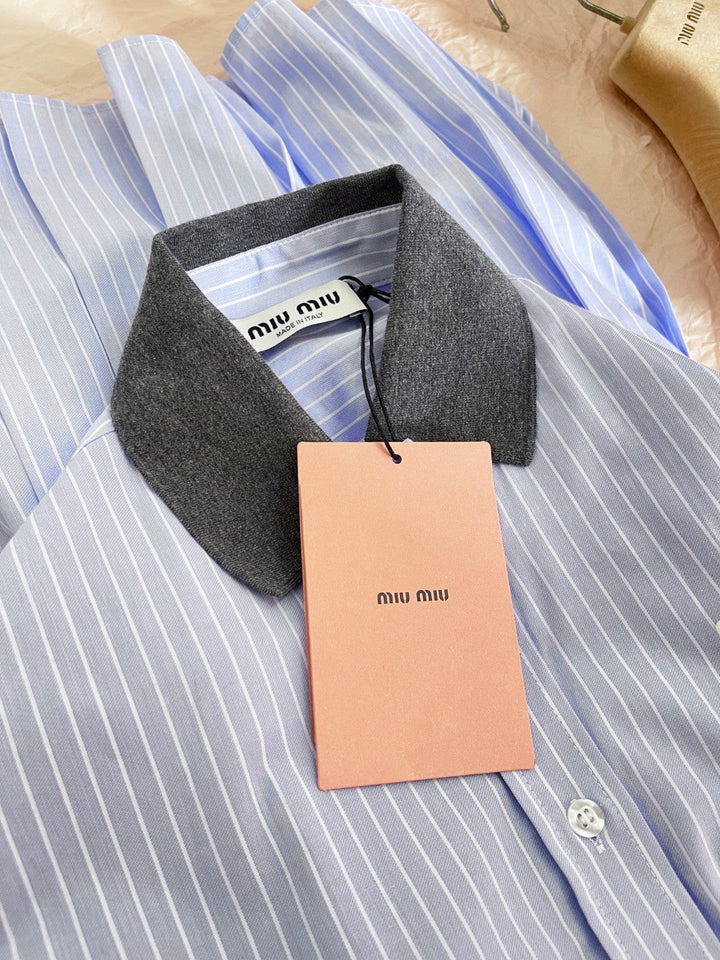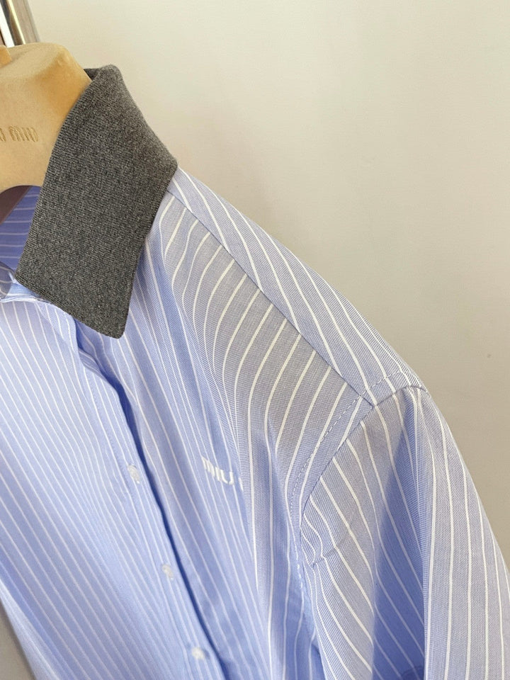 Blue Pinstripe Collared Shirt Dress with Pleated Hem