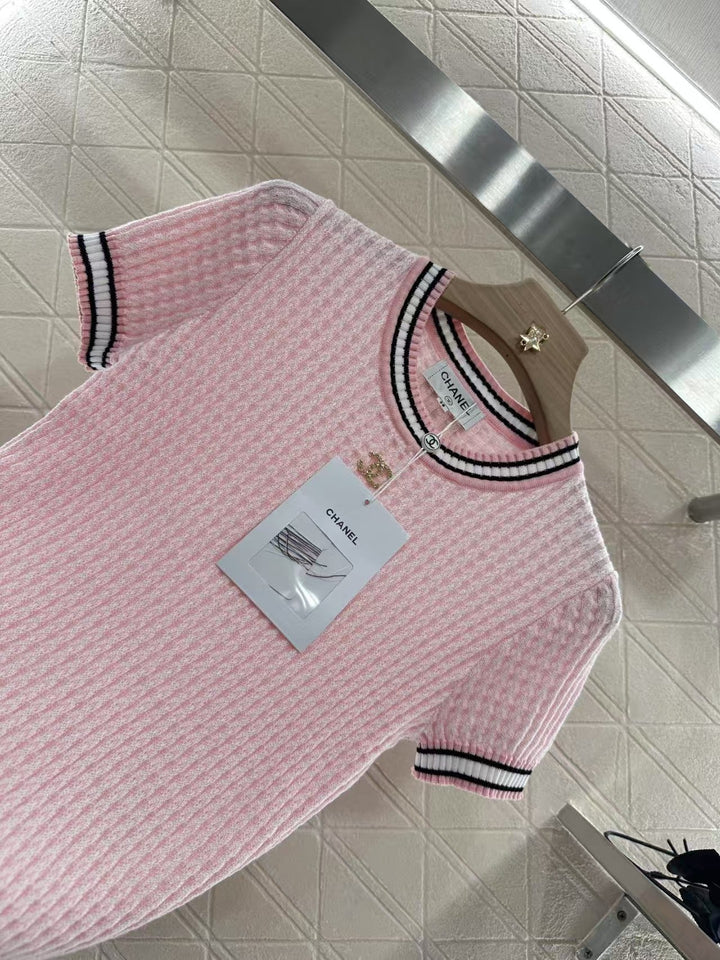 , texture et confort haut de gamme, plein d'élasticité, manches courtes à col rond, bords rayés décorés sur l'ourlet de l'encolure et les poignets, avec décoration de broche double C tridimensionnelle, soulignant la personnalité de la marque, soulignant le sens haut de gamme de l'usure, élasticité dans tout le corps, plus exquis, ne se limite pas à la forme du corps, les rayures verticales des aisselles rendent l'usure plus amincissante, montrant un ton détendu, un luxe léger et un tempérament à la mode, le premier choix pour les vêtements à la mode en toutes saisons