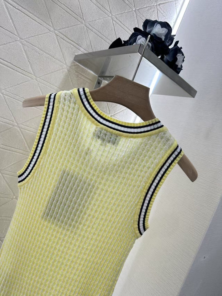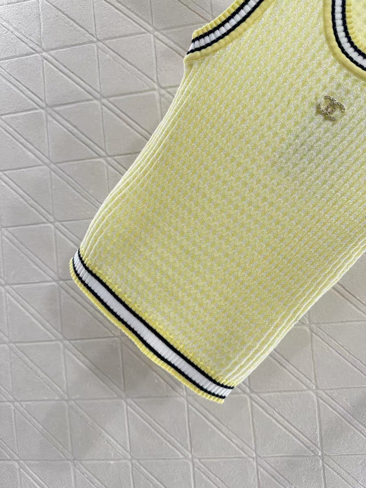 , texture de haute qualité et confortable Pleine d'élasticité Version gilet à col rond Les bords rayés sont décorés sur l'ourlet de l'encolure et les poignets Avec décoration de broche double C tridimensionnelle Mettez en valeur la personnalité de la marque Mettez en valeur le sens du port haut de gamme L'élasticité sur tout le corps le rend plus exquis Aucune restriction sur la forme du corps Les rayures verticales des aisselles rendent la tenue plus fine Montrant un ton décontracté Luxe léger et tempérament à la mode Le premier choix pour des vêtements à la mode en toutes saisons