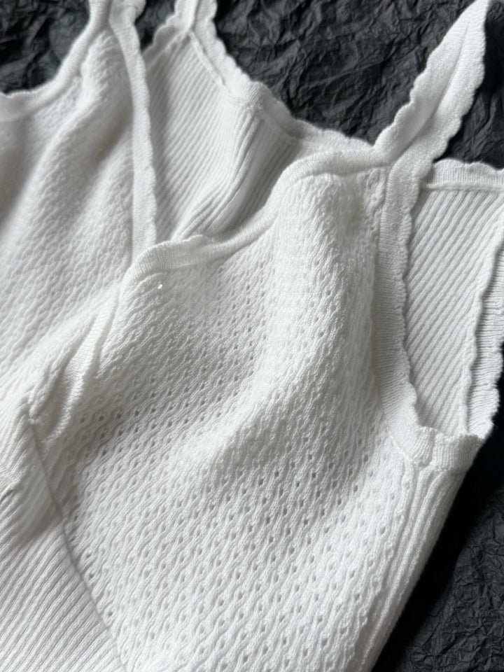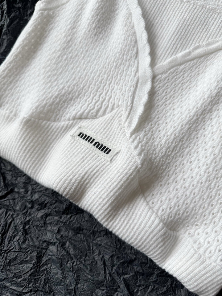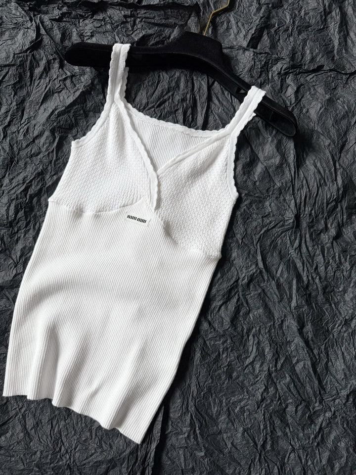 Simple, fashionable and exquisite. Imported Egyptian cotton miu stretch knitted vest. The gospel of miu girls. Knitted vest. All three colors in the closet are irresistible. It really is all in ~~. It is enough to prove how comfortable it is to wear ✌️. Custom-woven and dyed pure cotton knitted fabric. Hollow weaving method and new pattern splicing. Full of elasticity and infinitely beautifying the figure. A circle of small lace jacquard edging is full of girlishness.