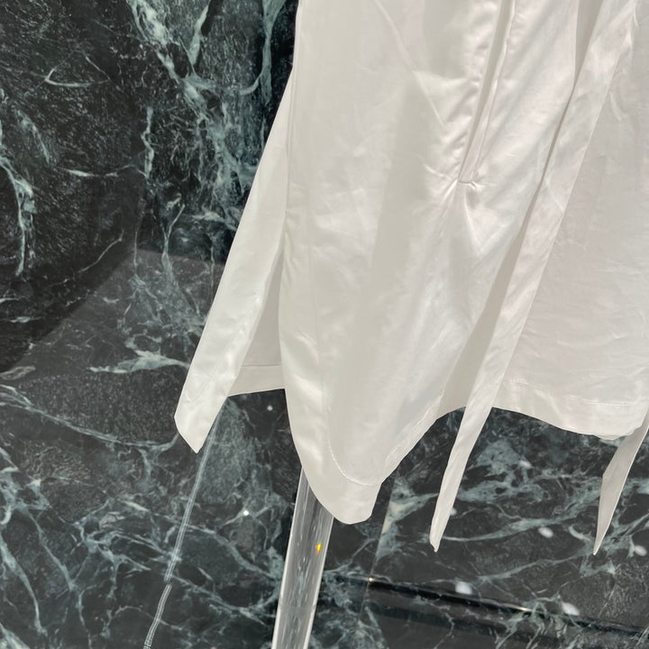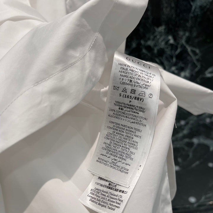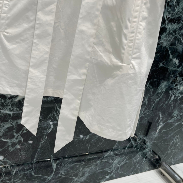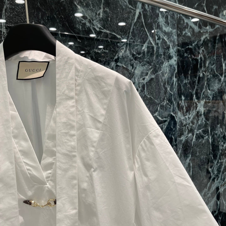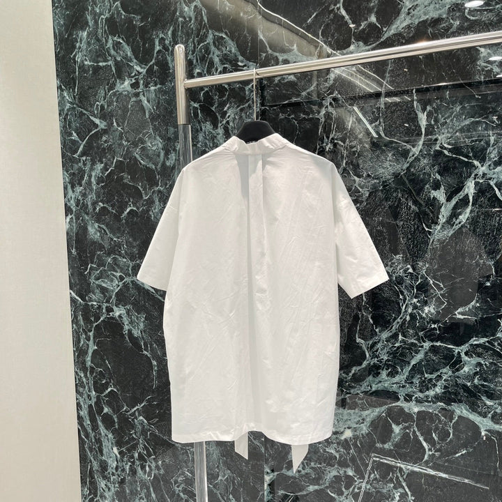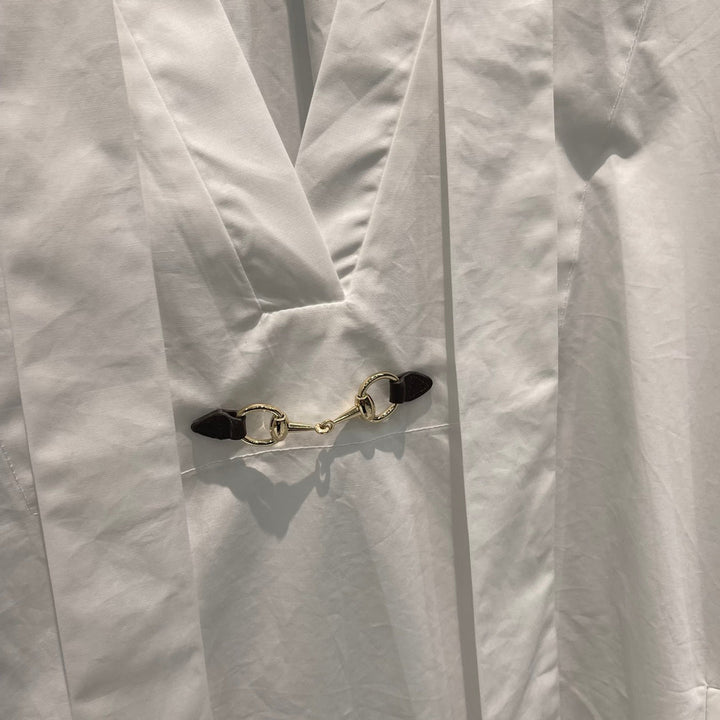 Chemise à ruban mors de cheval Col personnalisé Conception de ruban long Coupe de chemise à larges poignets Décoration en cuir mors de cheval sur la poitrine Simple et avancé
