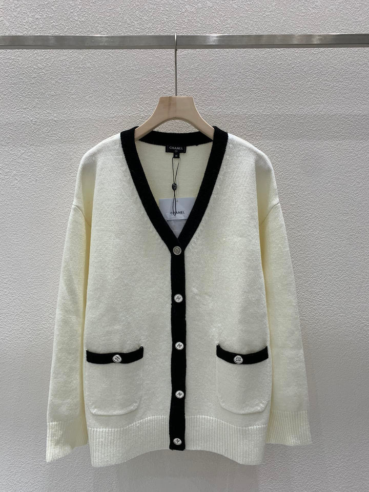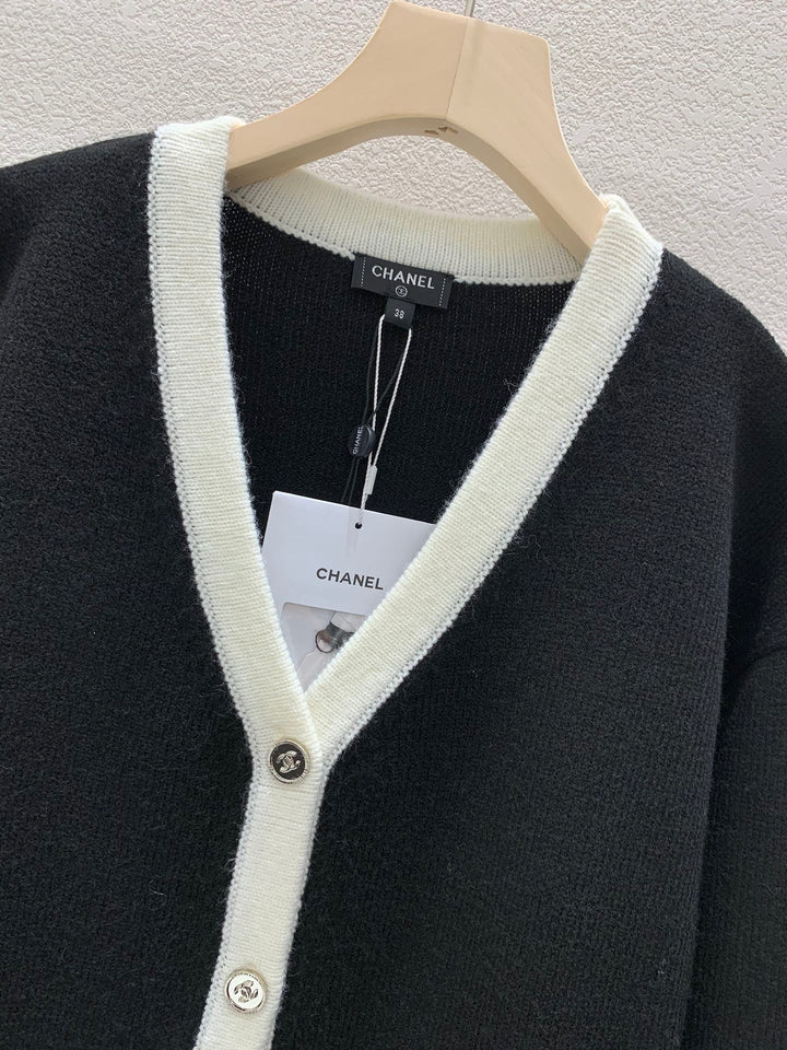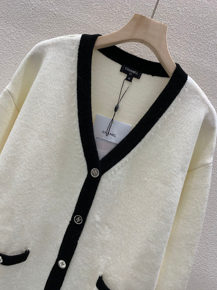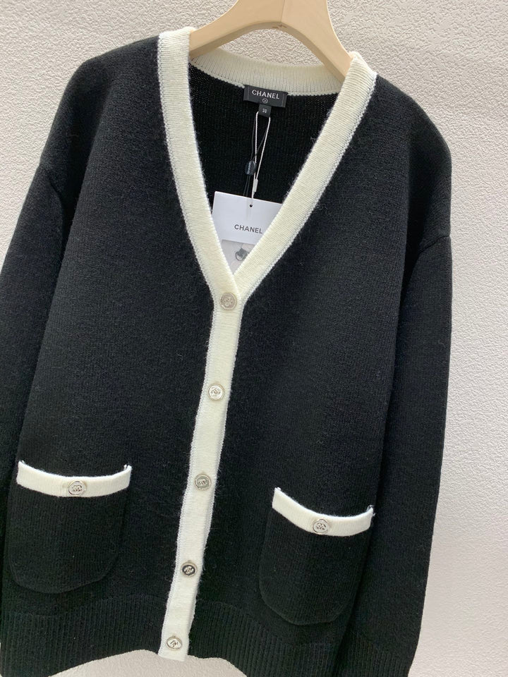 Fil de laine importé YB personnalisé + coutures en cuir, texture de haute qualité, texture évidente, coupe cardigan à manches longues, version ample à épaules droites, s'adaptant à la forme du corps et montrant l'aura, les poignets avant sont décorés de la texture torsadée emblématique de Chanel comme bordure, plusieurs poches en cuir diamant sur le côté du bras font écho au double bouton moulé, ce qui rend le design plus haut de gamme, élégant et cool, peut être porté à l'intérieur ou à l'extérieur en automne et en hiver