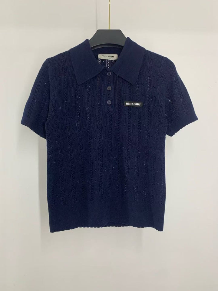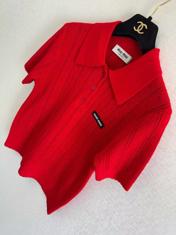 Wool polo vertical openwork knit short sleeves
