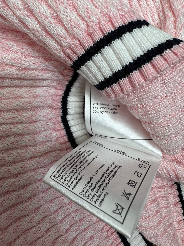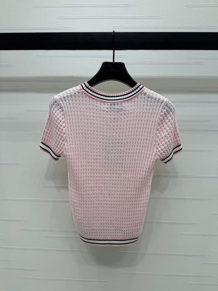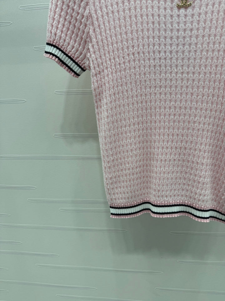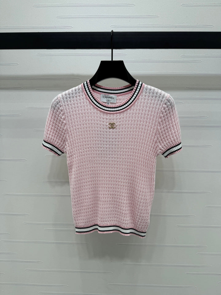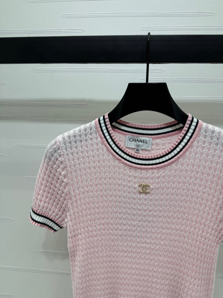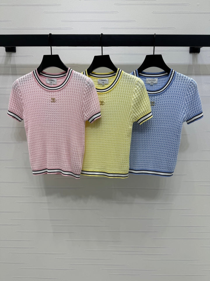 CHANE* 20250525 latest spring and summer series! Round neck slim fit knitted short sleeves! Custom knitted material, delicate texture, soft and comfortable Round neck knitted short sleeves are cut with crochet textures throughout the body to outline the ribbed texture pattern, highlighting the high-end sense of wear Contrast thread trims on the neckline, cuffs and hem With its elastic properties, it fits the body shape and makes you look slimmer Double C logo decoration on the chest Adds exquisite tone Shows the brand tone Versatile style does not pick age and skin color! 3️⃣ colors! S-M-L