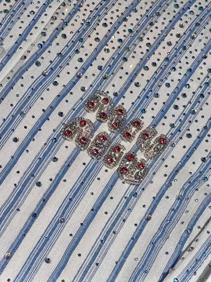 Who can resist such a beautiful sparkling diamond shirt in baby blue? Heavy hot diamonds