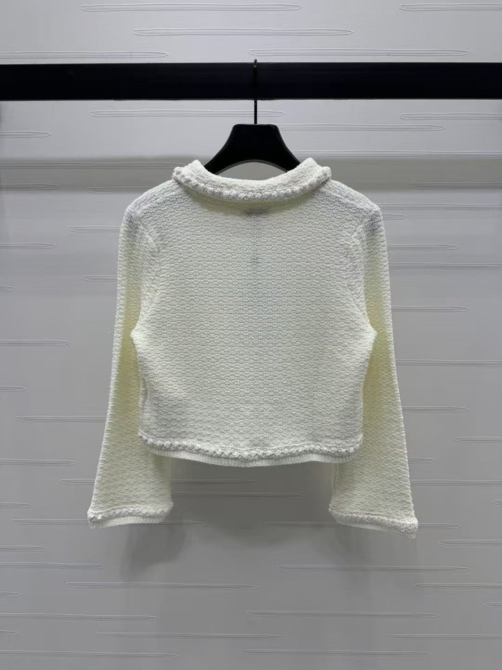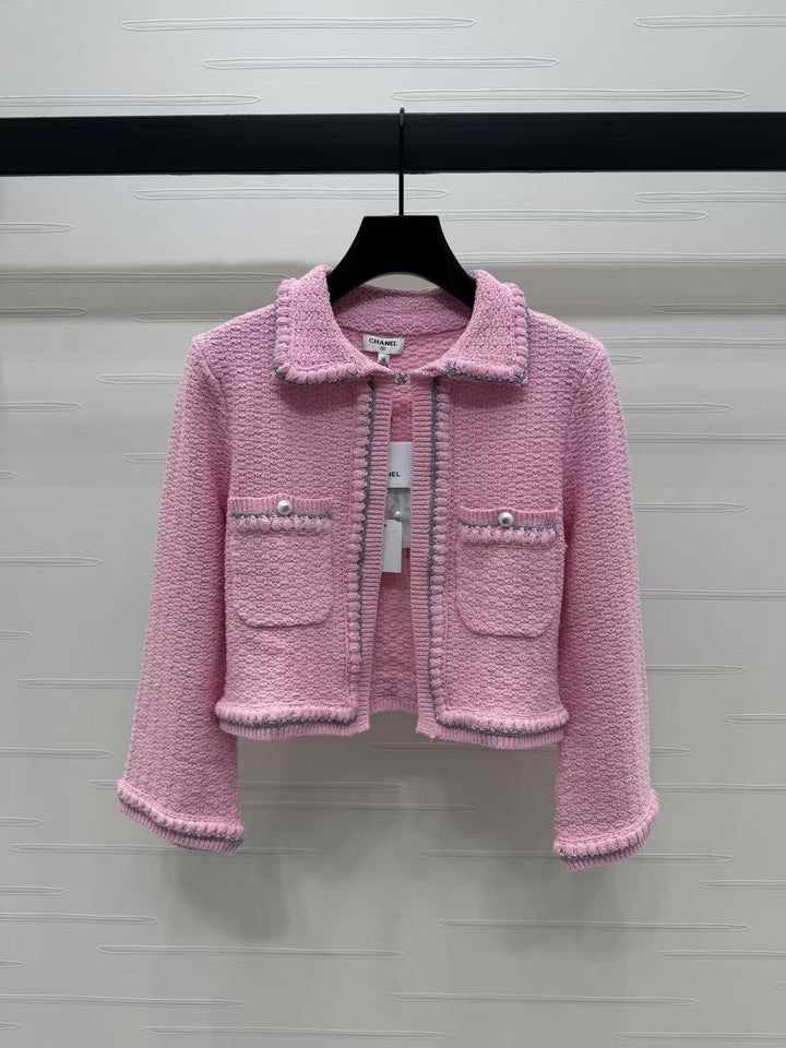 The latest collection of 2025 Spring and Summer! Lapel knitted cardigan! Made of custom wool yarn, with obvious texture and soft drape. Lapel cardigan jacket style. The straight shoulder design fits the human body, making the figure more slender and upright. The front is open, which can be matched with a variety of matching options. The symmetrical pocket design on the chest is highlighted by the pearl round button on the upper edge. The three-dimensional woven binding edge outlines the outline and is interspersed with the solid color of the body. The lady style is immediately revealed, which perfectly interprets elegance and is suitable for different occasions!