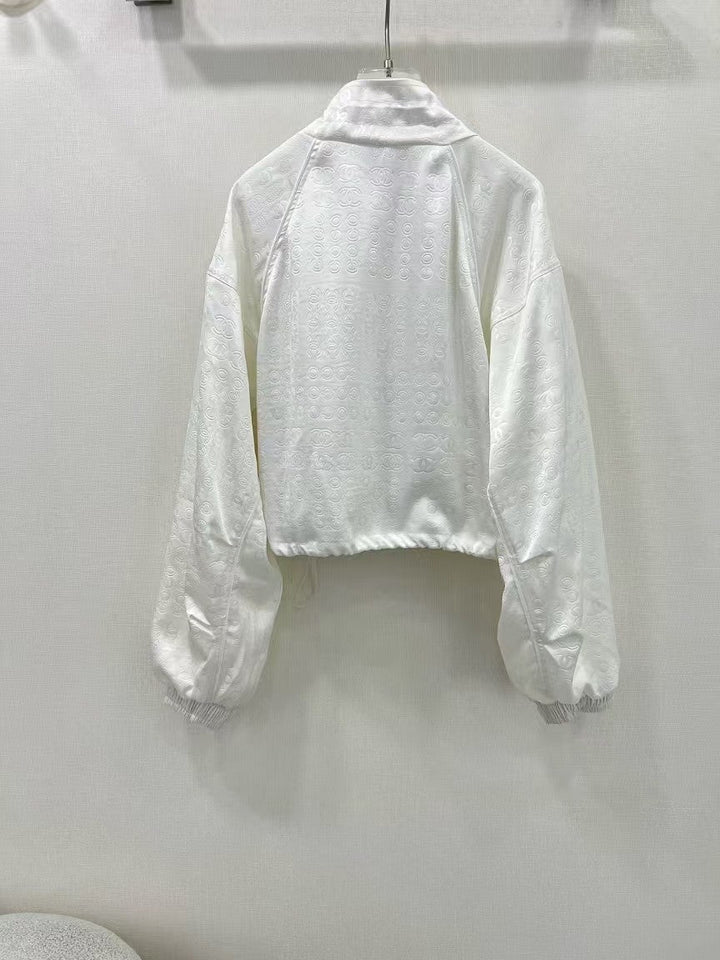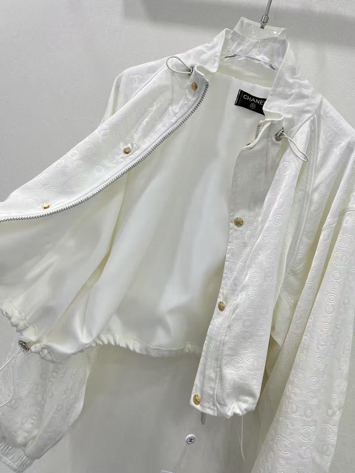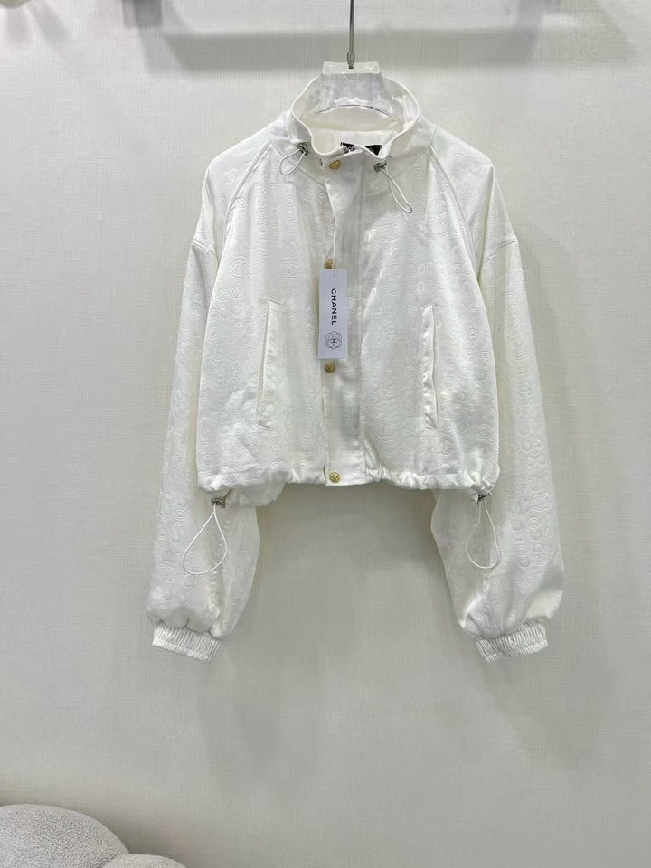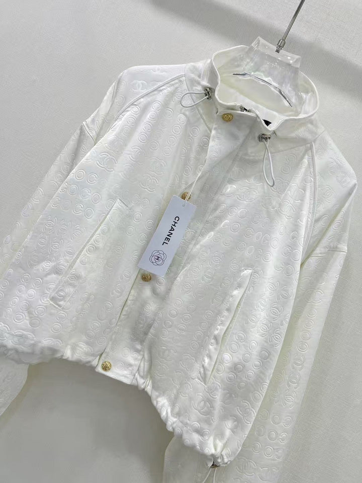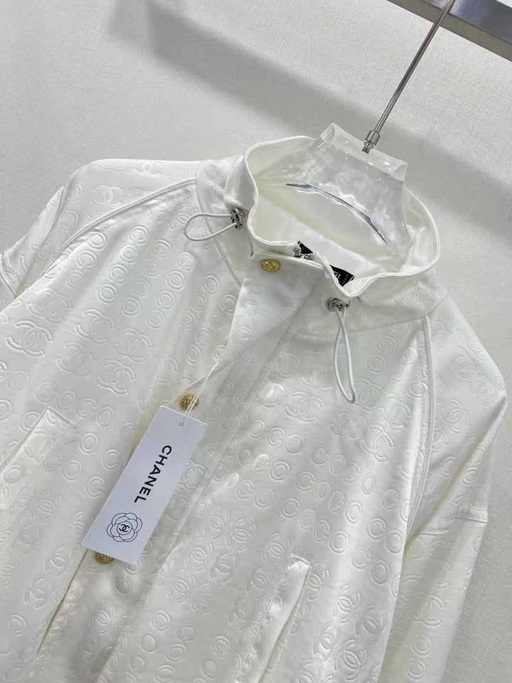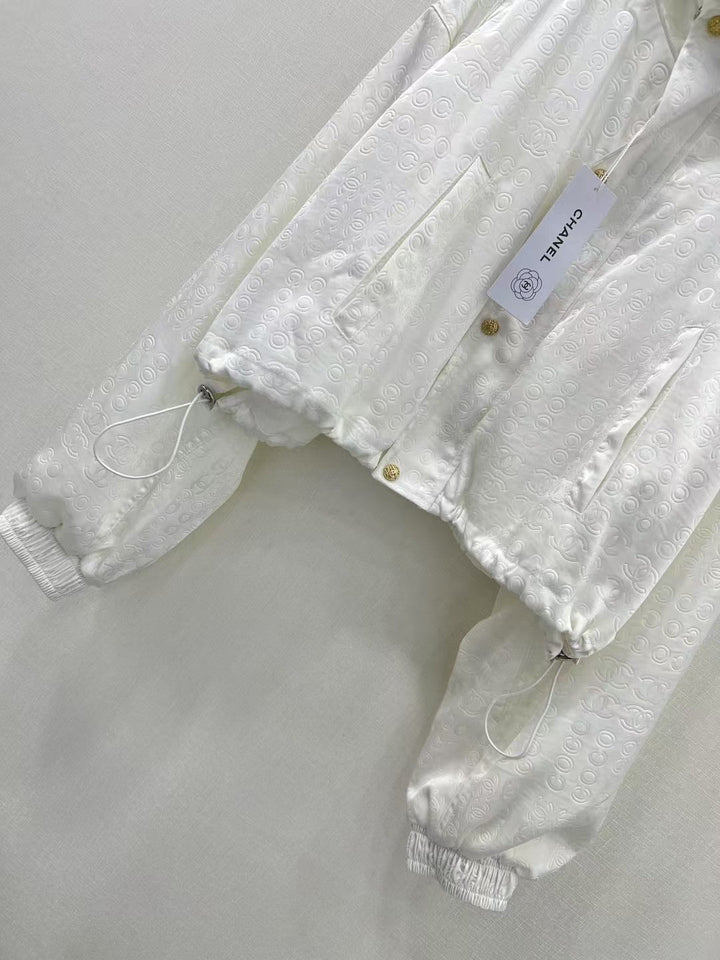 25 new sun protection jacket Satin dark pattern coco series double C letter logo hooded off-shoulder jacket The drawstring at the hem creates a visual layering. Wear it to create a neat and handsome look. It has a retro and fashionable feel. The details are in place. The texture is wide and comfortable. The classic style is not picky and makes the upper body look very thin! A must-have for white, rich and beautiful women