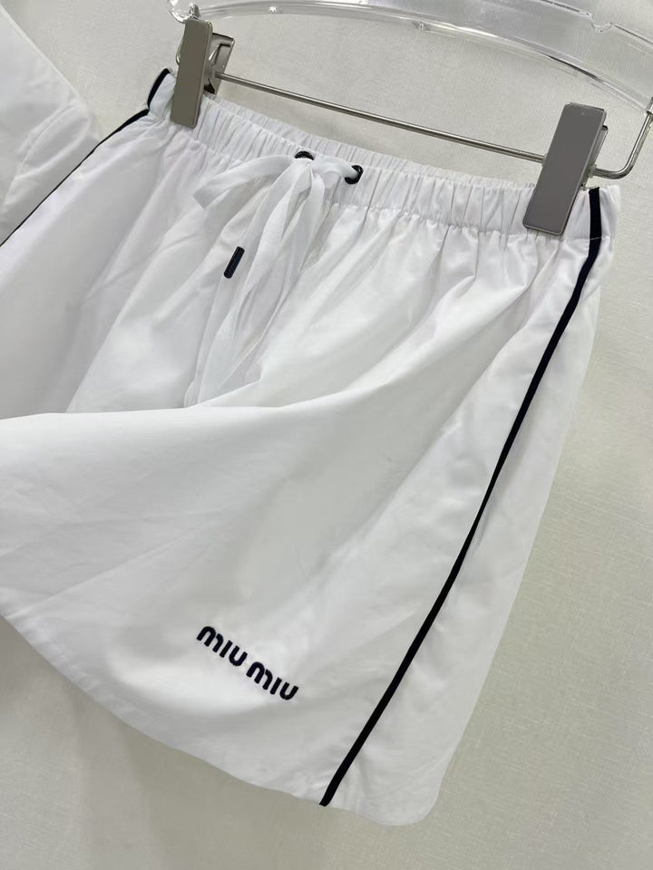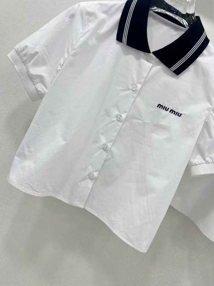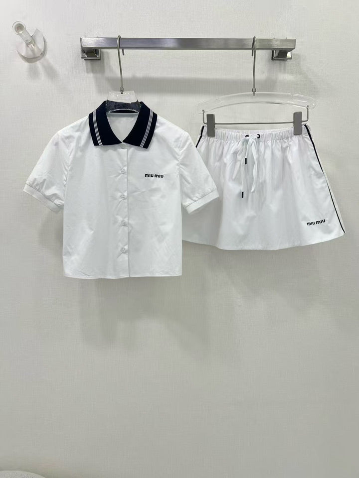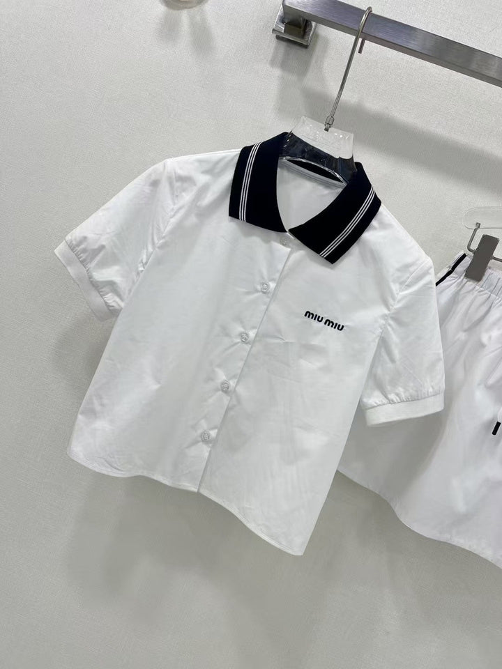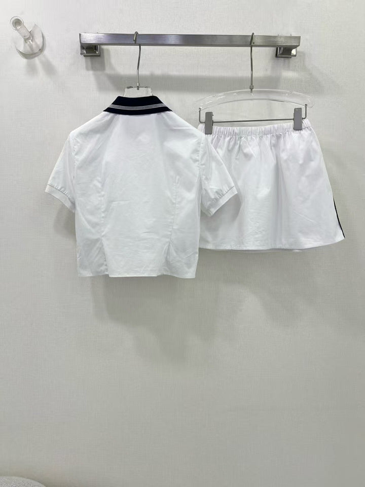 Pure white girly temperament match super! College style contrast navy blue knitted collar! Embroidered letters 𝐥𝐨𝐠𝐨 low-key luxury, original custom cotton fabric texture super good. A set of matching version of the upper body is very slim! Sweet and salty temperament is versatile and does not pick people!
