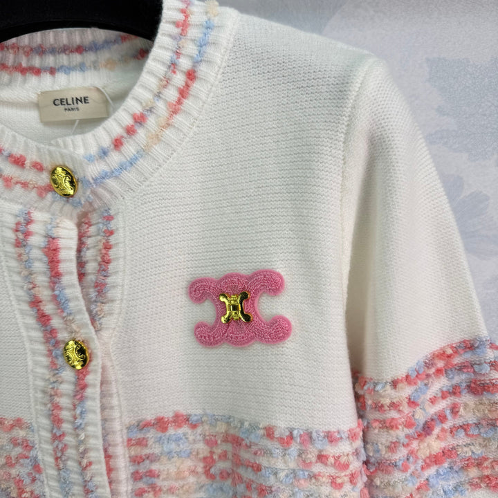 2025 Early Fall New Arc de Triomphe knitted round neck long-sleeved cardigan! Custom wool yarn weaving, soft and skin-friendly, comfortable and stylish. Round neck long-sleeved cardigan version with a collar that adjusts to reveal skin and beautify the head-to-shoulder ratio for a slimmer look. Collar with contrasting color stripes and hemming echoes the overall body. Strong retro style. Single row of engraved buttons with Arc de Triomphe logo decoration on the chest. Show your taste, playful and age-reducing, easy to wear for daily travel or gatherings