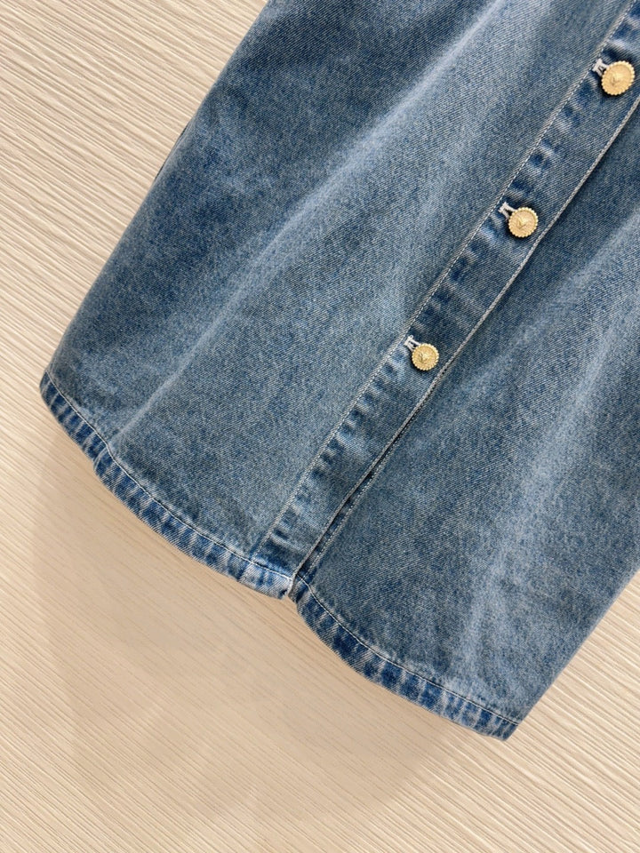 Custom YB twill cotton denim fabric is refined, breathable, and comfortable. Multiple enzyme washes create a vintage, distressed denim look with a faded blue to a bleached white. This sleeveless vest dress features a woven hem at the cuffs, waist, and pockets. This complements the double C embroidered logo on the back, adding a touch of relaxed freedom and flair, showcasing the brand's trendsetting positioning. The draped waistband creates a slender waist, while the perfect length accentuates the long legs, adding a visual highlight. This stylish and fashionable outfit is a must-have for commuting and dating.