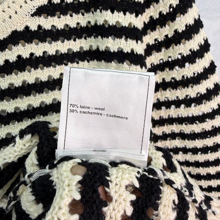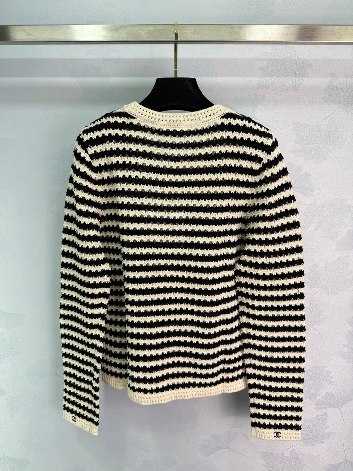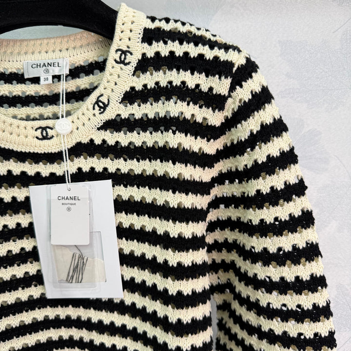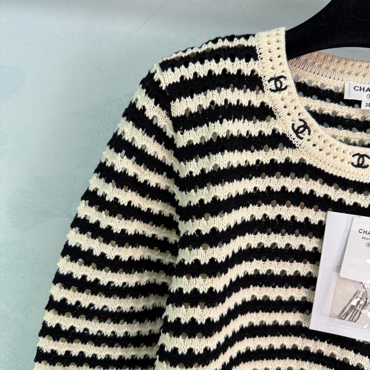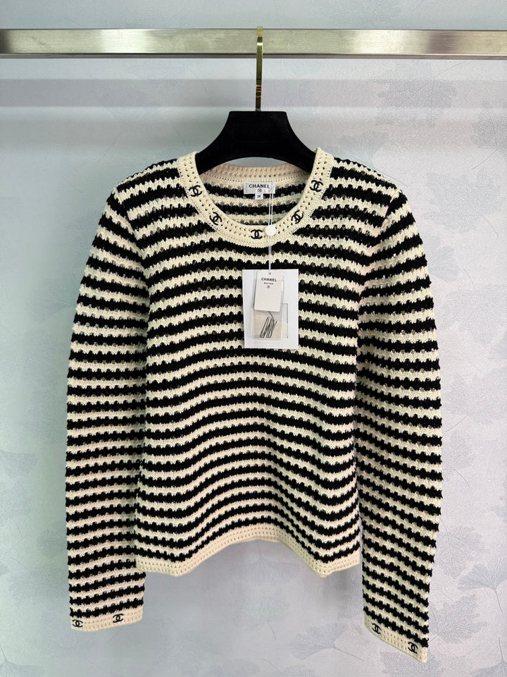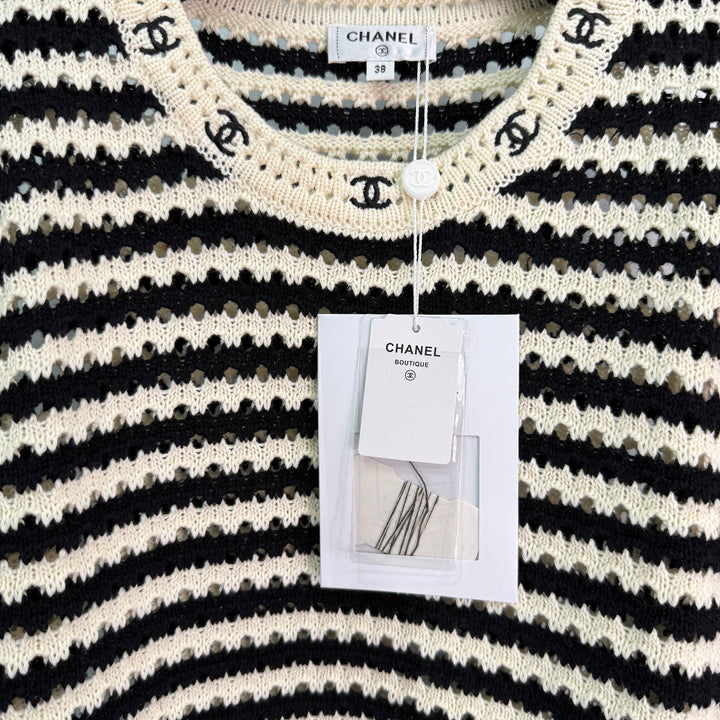 New for early fall, this high-end black and white woven-trimmed top with contrasting lettering is youthful, stylish, and versatile! The contrasting lettering and logo design are accented with luxurious, sophisticated embroidery. The classic round neckline and slim fit create a versatile, stylish, and sophisticated look. Available in one color and three sizes, S-L.