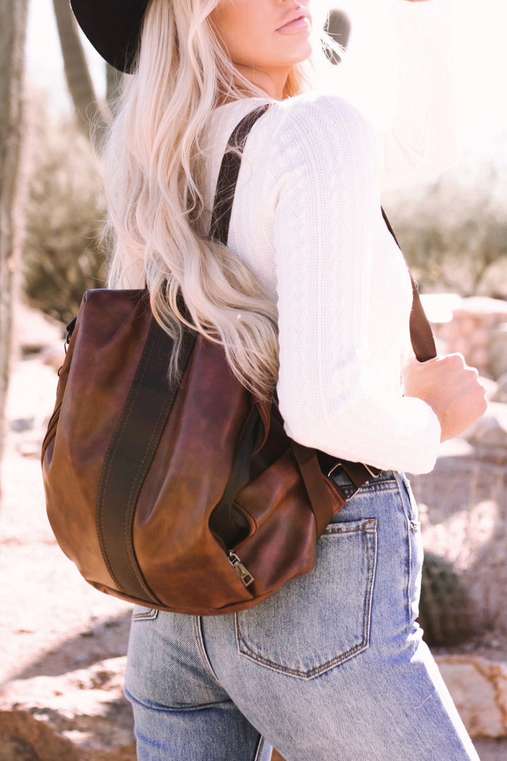 Mutilfunctional brown faux leather backpack. Hand strap to carry or can be worn as a backpack. Super soft slouchy material so cute and on trend. Very roomy.