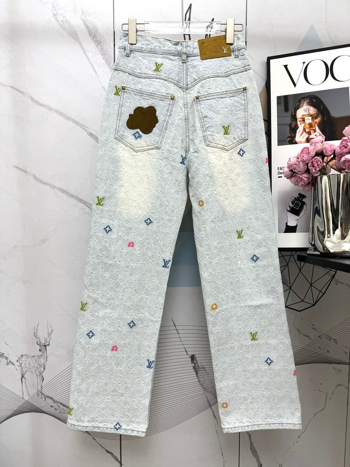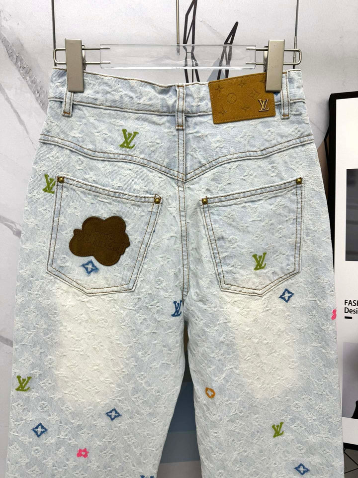 Hot sale [New models on the shelves] Louis Vuitton co-branded Tyler jacquard full-print logo candy series denim trousers. The same style as celebrities, embellished with cut flower details, combining jacquard craftsmanship and cut flower craftsmanship design, and incorporating Monogram Cray pattern elements. The complex patterns and patterns woven on the fabric not only add to the overall texture, but also make the front part more refined. This top is super good-looking 👍👍 a must-have for trendy people,