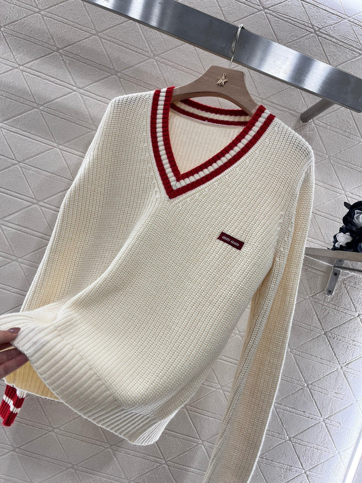 Custom wool yarn weaving, high-quality texture, comfortable and soft V-neck sweater cut, dense knitting, cold and windproof, fine and regular tailoring, no need for flashy decoration, simple striped contrasting edging + letter logo pattern can easily highlight the brand tone, with red and creamy white literary texture, make autumn and winter wear more gentle and elegant, straight shoulder loose version, accommodating body shape, fashionable and casual