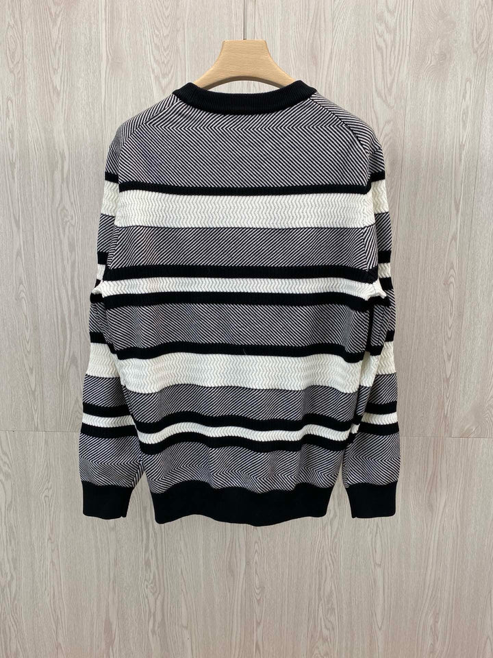 Classic striped drop shoulder sleeve shape design, men and women can easily manage, widely wearable. Wool yarn material, striped colour weave closely linked, silk texture and self elastic pressure effect, not easy to shrink. Stripe colour separation design to make the overall shape full of personality, each stripe needle point colour weave texture clear different... embroidery label embellishment between the obvious, drop shoulder sleeve design full of fashion personality temperament. Men's and women's models