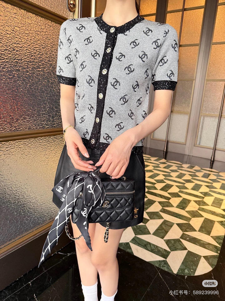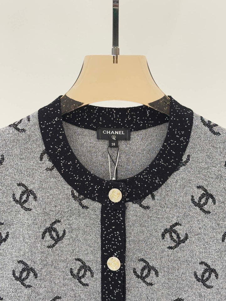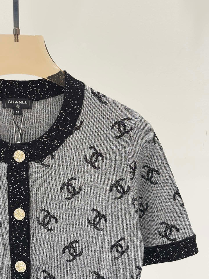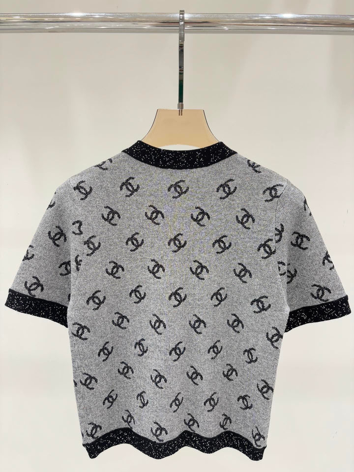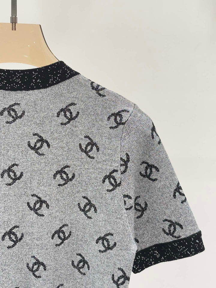This stylish summer essential features a relaxed fit with subtle elegance. The round-neck design showcases a bold letter logo in intricate jacquard pattern, while metallic thread detailing along the edges adds luxurious contrast. Made from breathable knitted fabric, it combines comfort with eye-catching appeal.