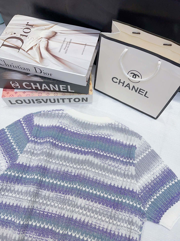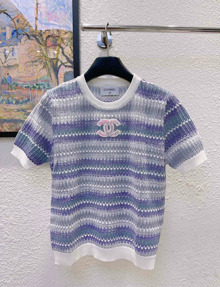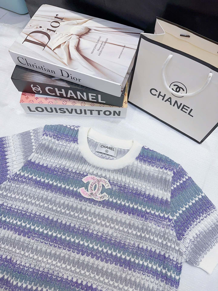 High-End Chanel-Inspired Short-Sleeve Knit Top with Crystal-Studded Double Logo