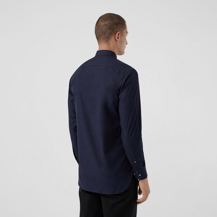 The yarn is custom-woven and dyed, the collar and cuffs are in invisible plaid, and the webbing buttons are all custom-made.