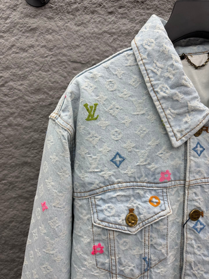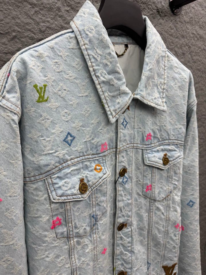 Craftsmanship: Custom-made original twill cotton jacquard denim, washed and distressed in a vintage light gray-blue, embellished with a monogram pattern. Leather patches on the sleeves complement the front pockets. Button-down denim. This collection is developed and can be customized.
