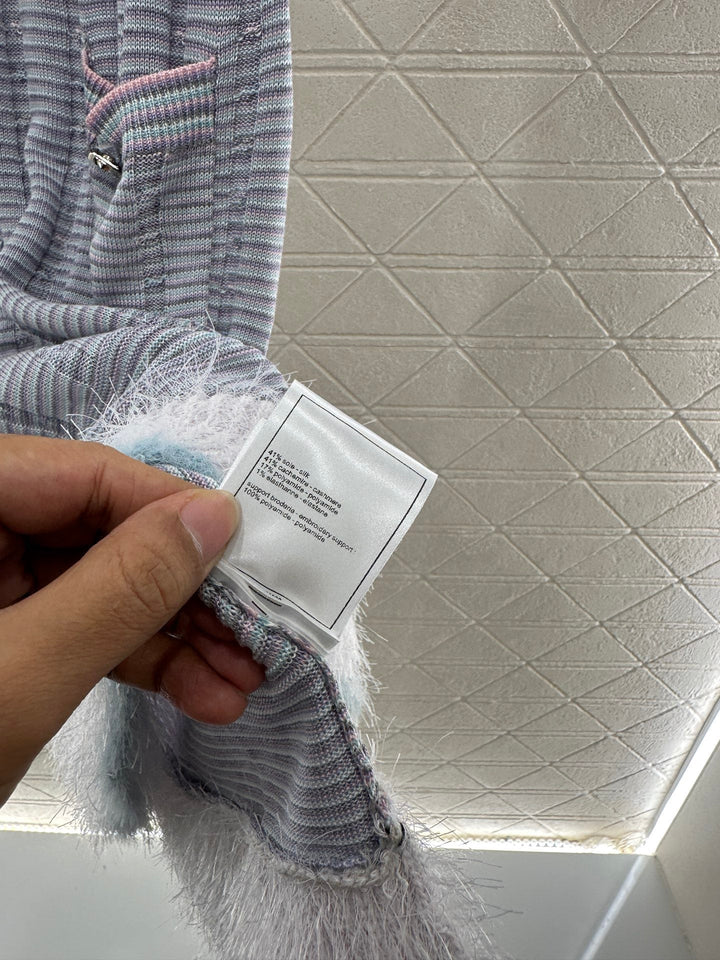 Woven from custom YB cashmere yarn, this dress is soft and comfortable, yet stylish. This round-neck dress features a crocheted neckline and cuffs with elastic ribbed texture. The embossed pattern creates a visual striped effect, creating a strong retro feel. The hem is cinched with horizontal stripes and expanded with tassels. This design is striking. Double C enamel buckles on the pockets add a touch of elegance. This playful, youthful, and youthful-looking dress is perfect for everyday wear or gatherings.