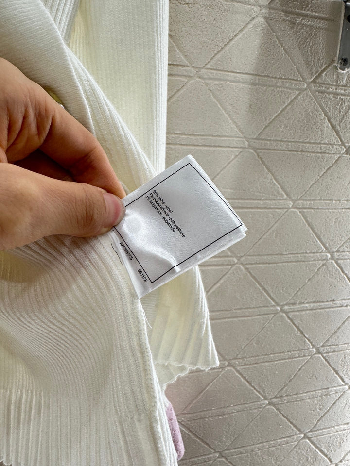 Crafted from custom YB wool yarn for a refined, comfortable, and skin-friendly feel, this round-neck knit cardigan features a finely crocheted texture throughout. Exquisitely ribbed hems and contrasting cuffs create a layered effect. The front placket echoes the top edge of the pockets. Decorated with the brand's signature double-C printed round buckle, this cardigan showcases individuality and enhances your outfit. This effortlessly stylish cardigan is perfect for both solo and layering, perfect for all-season fashion. Custom fabrics and accessories are also available.
