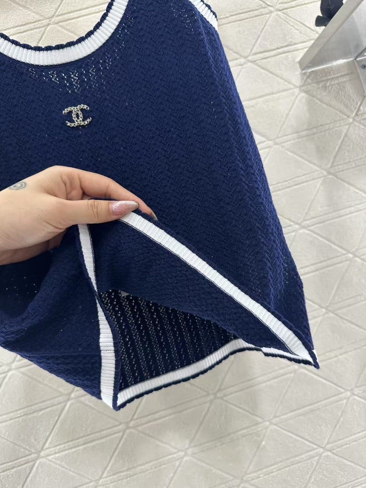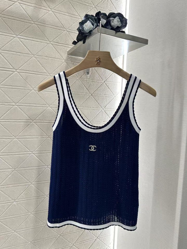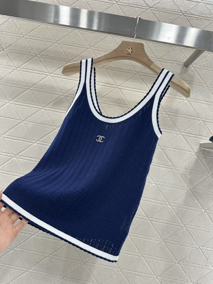 Customized YB wool yarn weaving, high-quality and comfortable texture, suspender cut, all-over royal blue background, white striped edging on the collar hem, double C letter rhinestone logo on the chest, highlighting the brand personality, highlighting the high-end sense of wear, slightly transparent and hollow, making simple styles sexy and individual, elastic and tight for more exquisite, slimming, showing a relaxed tone, light luxury and fashionable temperament, can be worn alone or layered, the first choice for fashionable wear in all seasons