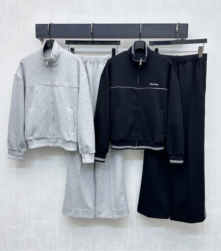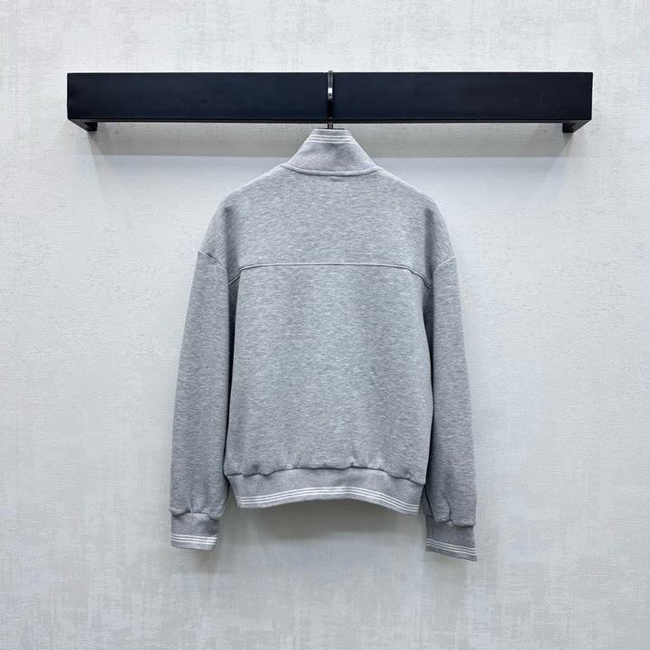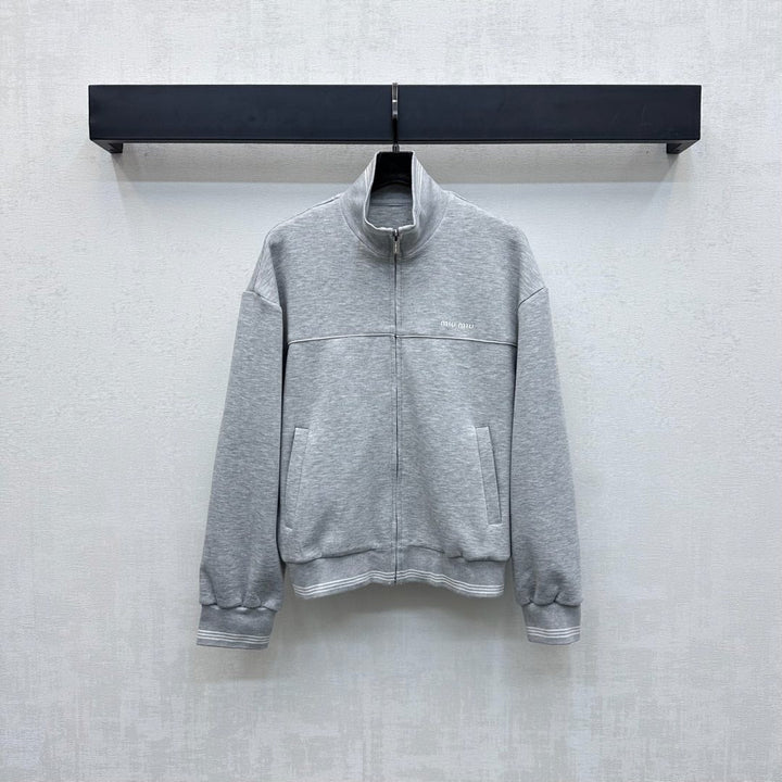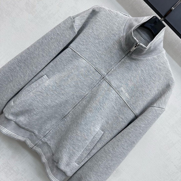 New arrivals for 2025. Made from custom YB imported air cotton, this top features a stand-up collar for breathable comfort and a refined feel. The adjustable zipper closure and striped ribbed hem at the cuffs and hem add layered detailing. The white banding at the bustline creates a contoured, flattering effect. The signature embroidered logo on the chest echoes the collection and highlights the brand's signature style. Developed fabrics and accessories. The stand-up collar and elastic waistband create a simple, casual, and stylish outfit.