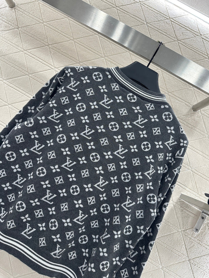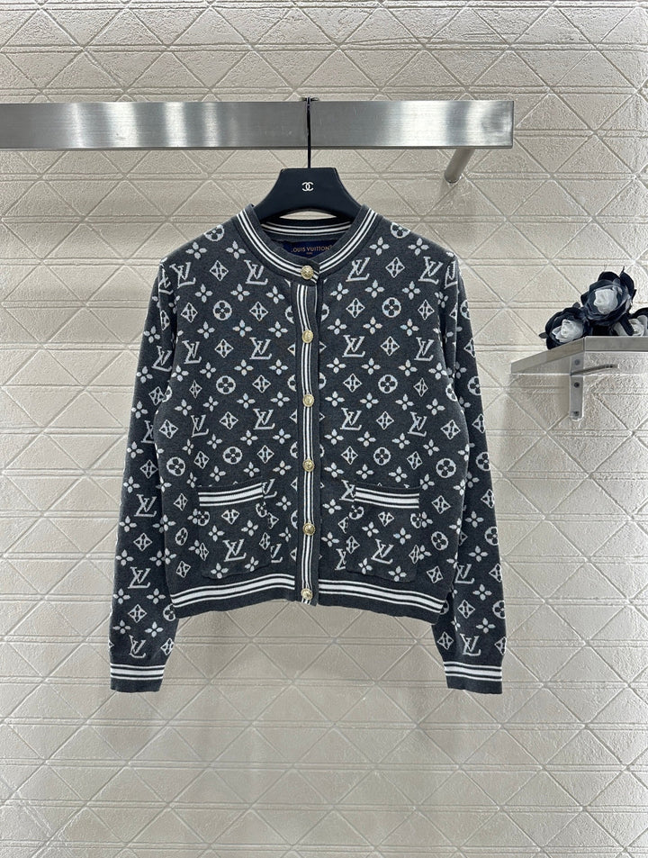 Crafted from custom YB wool yarn for a refined, comfortable fit, this round-neck knit cardigan features an all-over four-leaf clover logo and jacquard lettering. The hem is accented with tonal stripes for a striking contrast. The stretchy fabric creates a close-fitting, slimming effect. The front button is embellished with a printed logo, showcasing the brand's signature style. This versatile style is versatile for all ages and skin tones, offering a relaxed fit and a stylish, modern look. Custom fabrics and trims are also available.