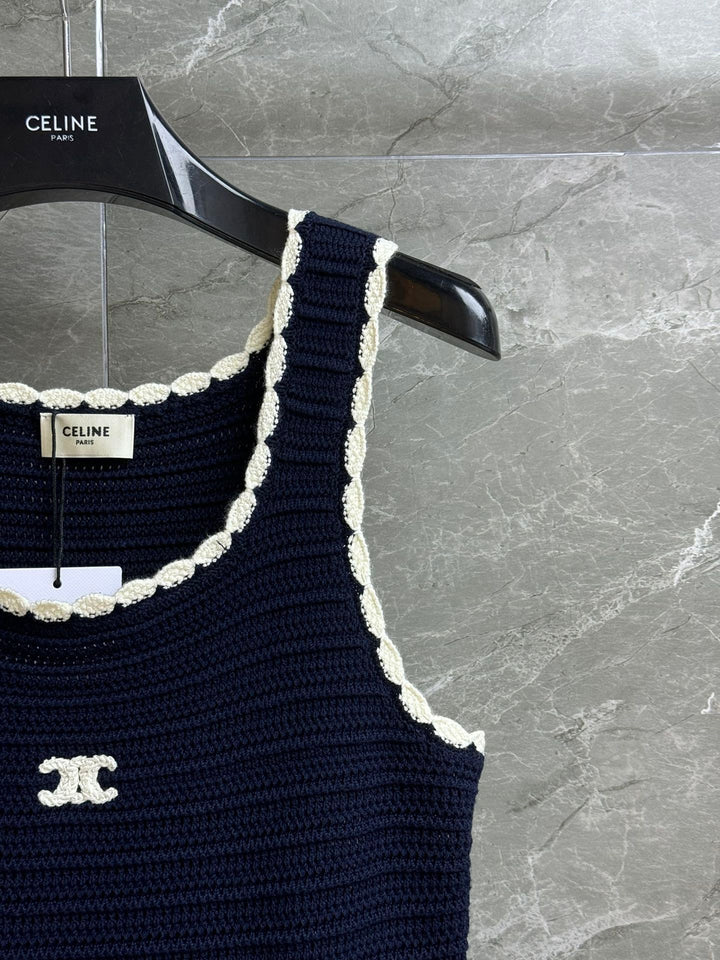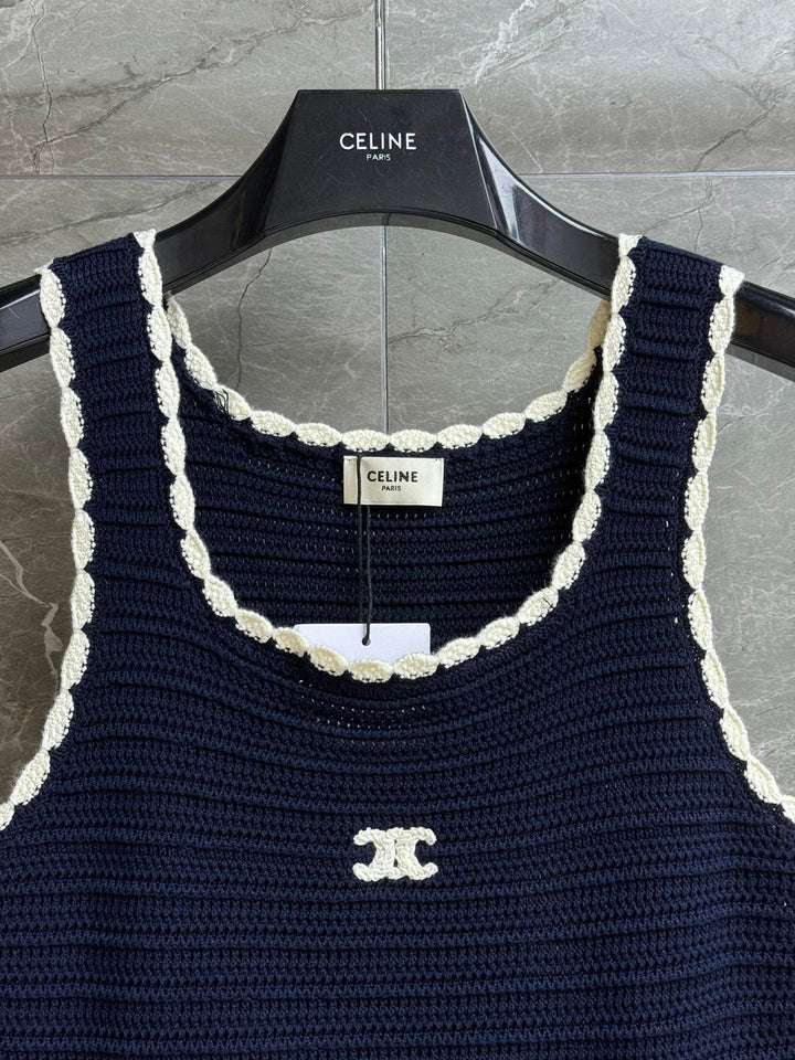 Crochet vest dress, 2025 Early Fall Collection, navy blue and white colorblocking, Arc de Triomphe logo embellishment, heavy crocheted texture, bohemian holiday style, lazy and high-end cotton knit fabric, comfortable and skin-friendly A-line skirt shape, slimming and elegant upper body, complete with trademarks