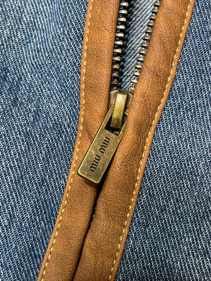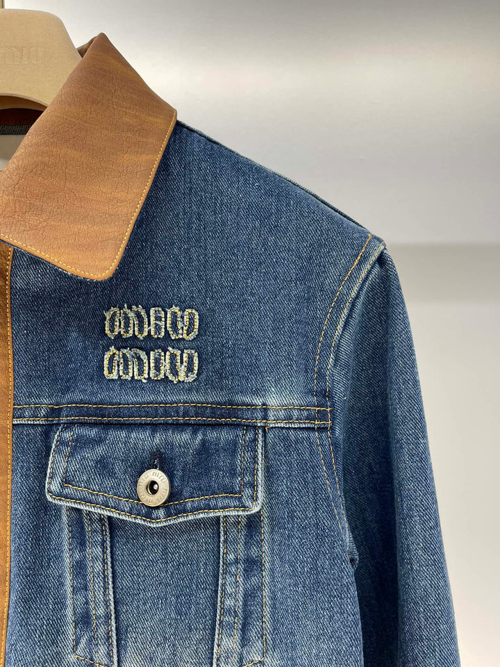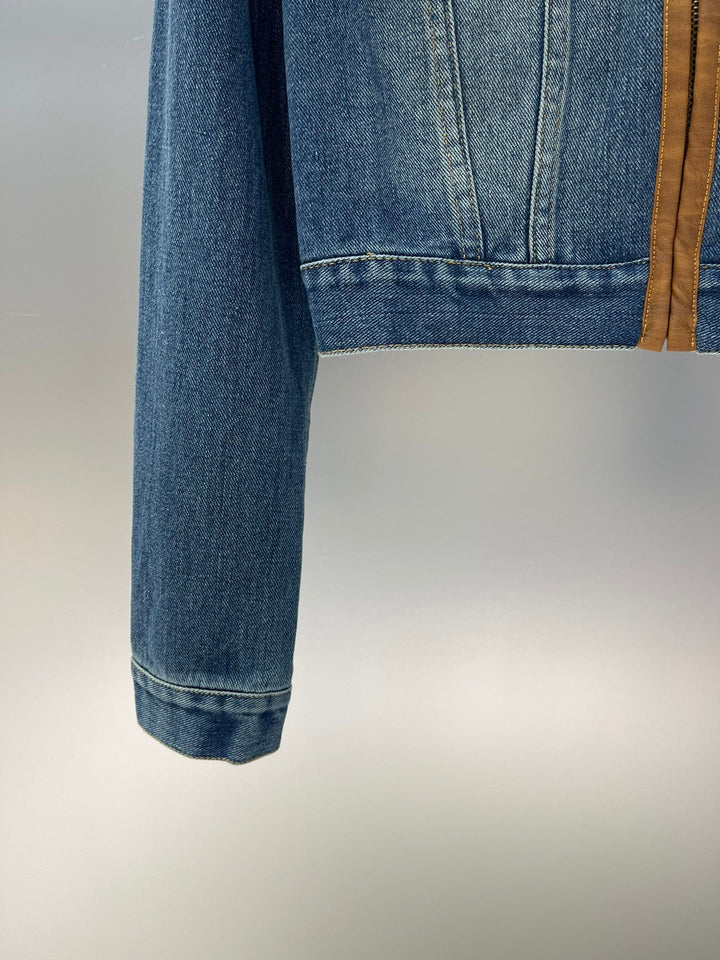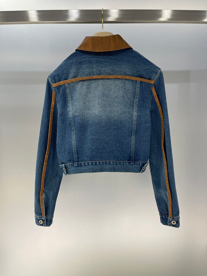 Leather trim lapel long sleeve short zip-up denim jacket