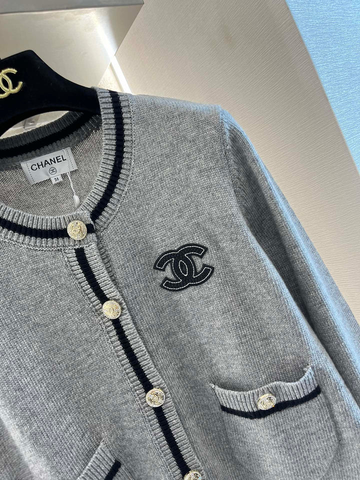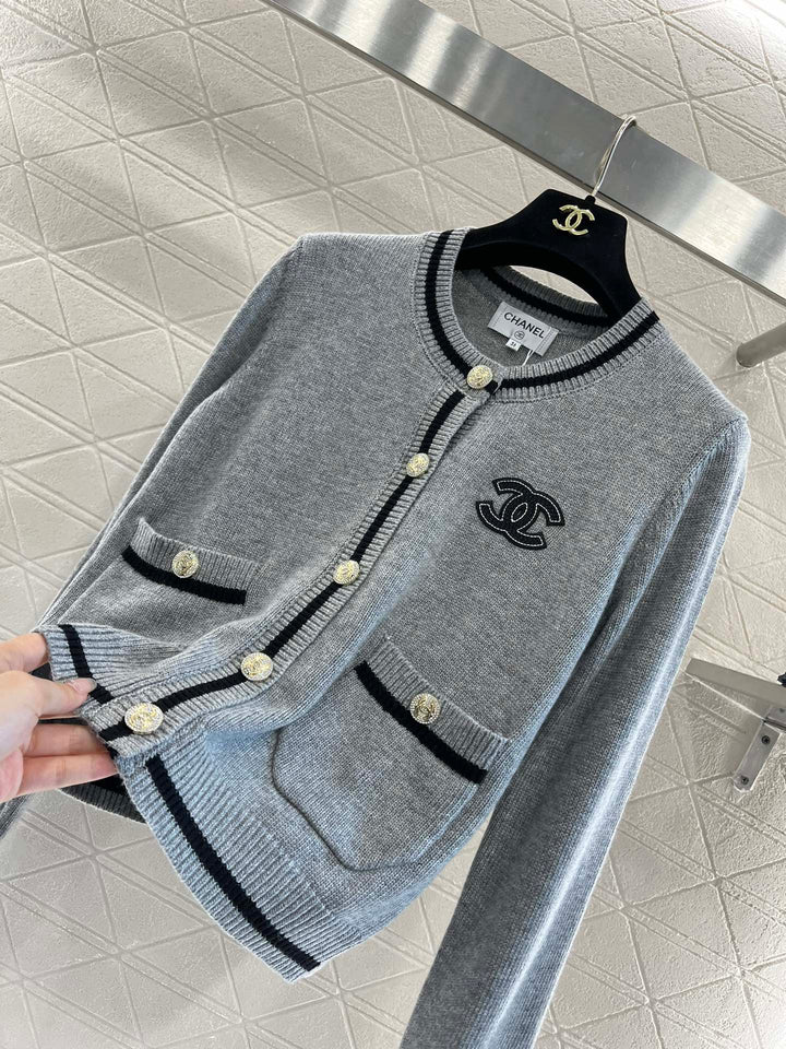 Woven with wool yarn, soft and comfortable, stylish and slimming. Round neck cardigan cut, decorated with hemming stripes. Choose classic black and gray color matching, full of exquisiteness. Logo crochet embroidery letters on the chest, with symmetrical pocket design, showing temperament college style, adding youthful atmosphere to the upper body, perfect for layering in autumn and winter