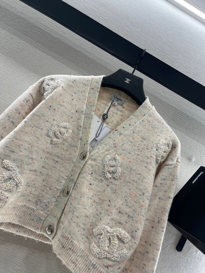 Crafted from custom YB cotton yarn, this cardigan boasts a refined texture and is comfortable and comfortable to wear. This short V-neck cardigan features a twist-button design that flatters the neckline and adds a touch of sophistication. The cardigan features a 3D plush double-C logo throughout, while the vibrant, colorful background adds a touch of energy. This stylish cardigan breaks the dull autumn and winter vibes and offers a stylish and sophisticated look. Custom fabrics and accessories are available. Check for the latest version. Available in three colors. 𝟯𝟲 𝟯𝟴 𝟰𝟬