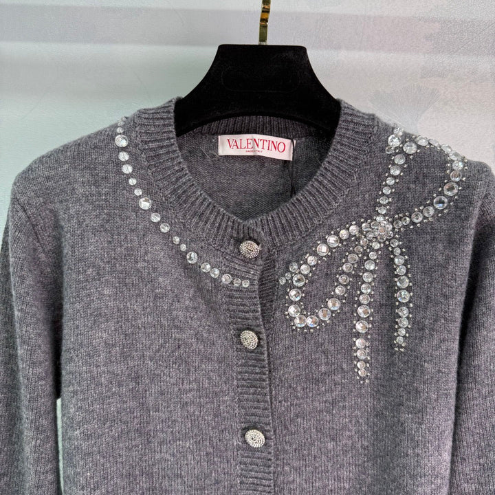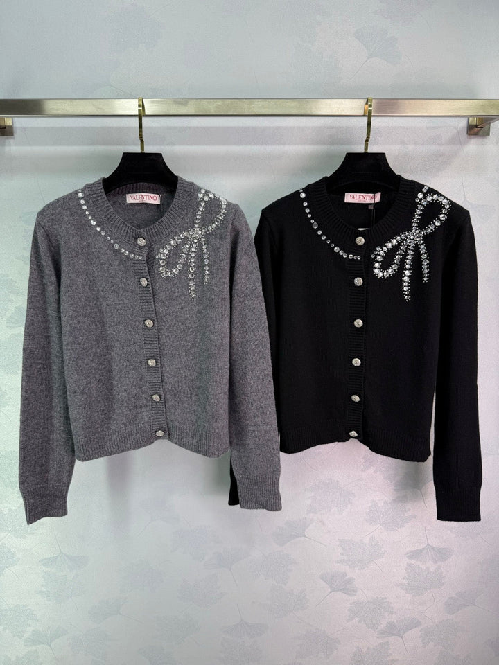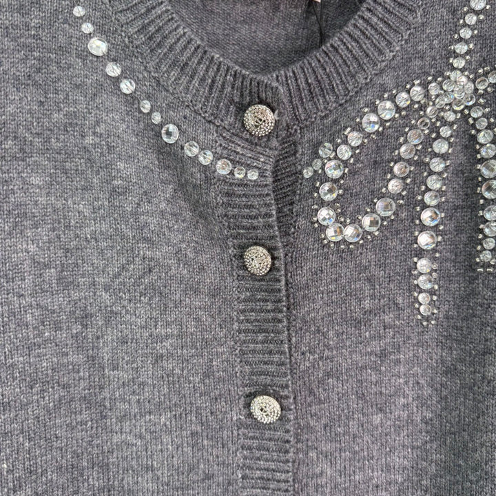 New 2025 Early Fall heavy-duty round-neck knitted cardigan! Custom-woven wool yarn for a premium, comfortable, and soft feel. Round-neck cardigan cut with a noticeable wooly texture. Densely knitted for warmth and windproofing. Hand-sewn detailing at the neckline, with large and small beads framing a bow pattern, creates a contrasting color scheme with the body. Simple elements combined with a gorgeous pattern fully demonstrate the brand's ingenuity. Heavy-duty diamond-encrusted buttons elevate the look. Slimming and versatile for fall and winter! Available in 2 colors and 3 sizes (sml)