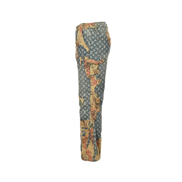 The exclusive custom woven all-over print type base fabric is complemented by a digitally printed floral top fabric. The quilting machine has been used to create a quilted stitching pattern that demonstrates a high degree of craftsmanship. The heavy duty washed aged finish allows for fading and destructive effects. Embellished with floral elements, these two pieces are infused with a strong vintage vibe, perfectly showcasing the collision of fashion and personality. Floral patchwork vintage jeans for men and women. Relaxed fit with delicate patchwork appliqué craftsmanship, which includes an ultra-intricate laser burnout appliqué with exclusive customised floral appliqué. These trousers present a gorgeous and unique floral pattern through the imported Tajima embroidery process, which requires 200,000 stitches of meticulous embroidery per piece. Diamond-shaped inter-cotton checkered design, high degree of counterpoint to the line process, as well as heavy-duty wash carving broken position precise cut delicate. Unisex
