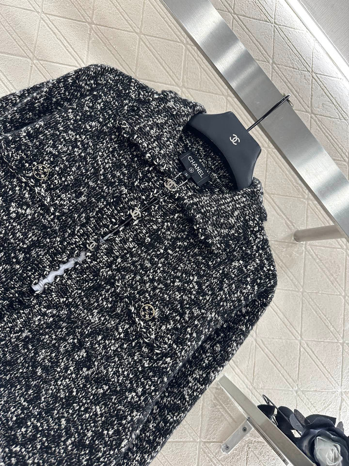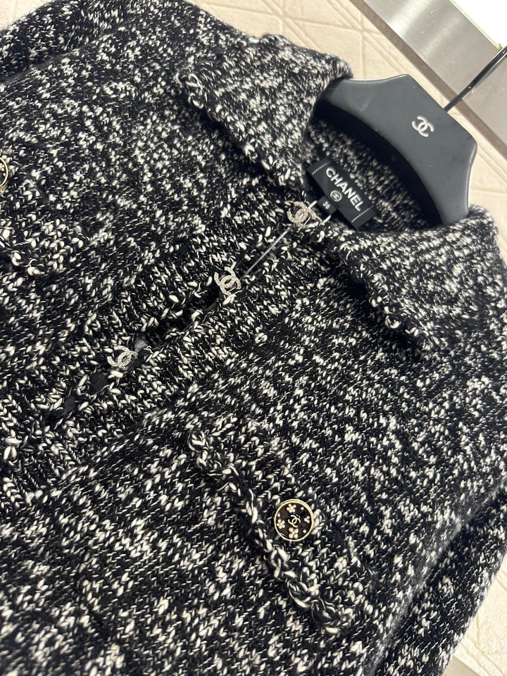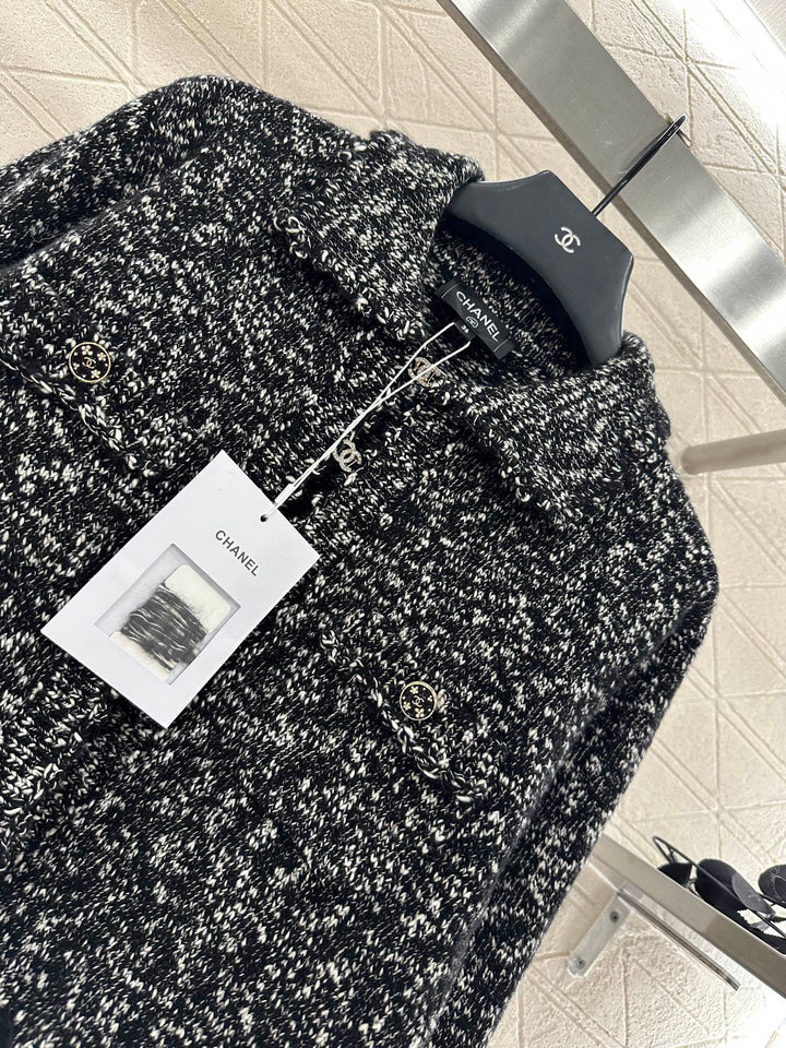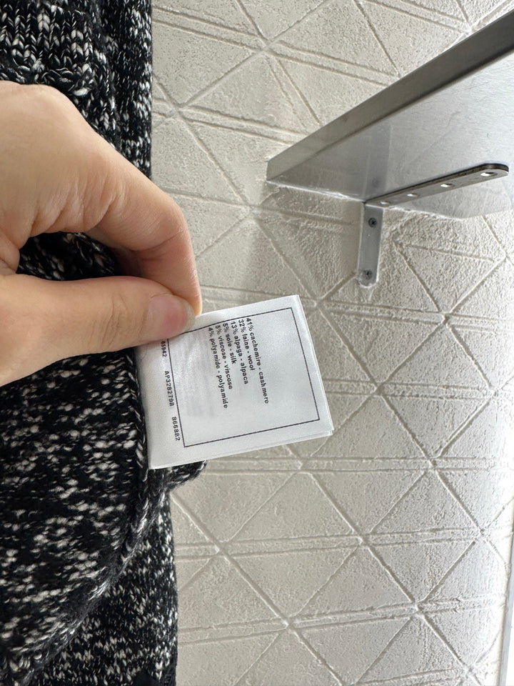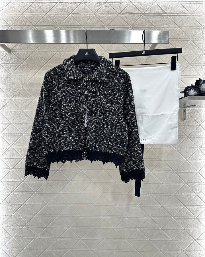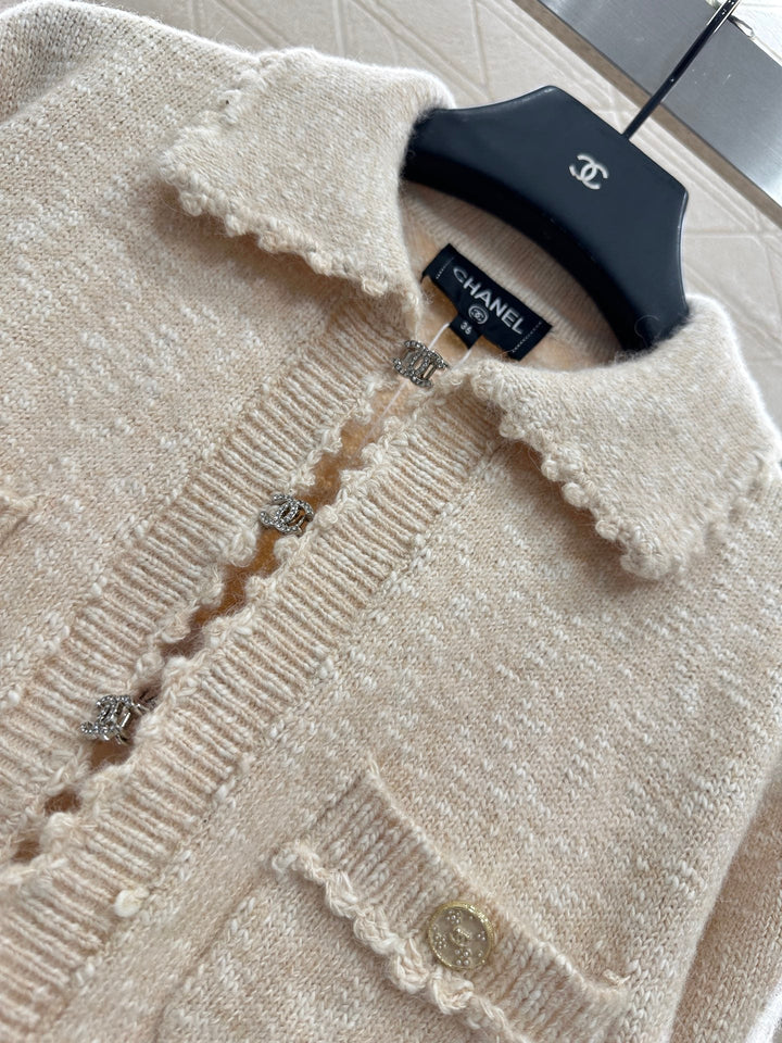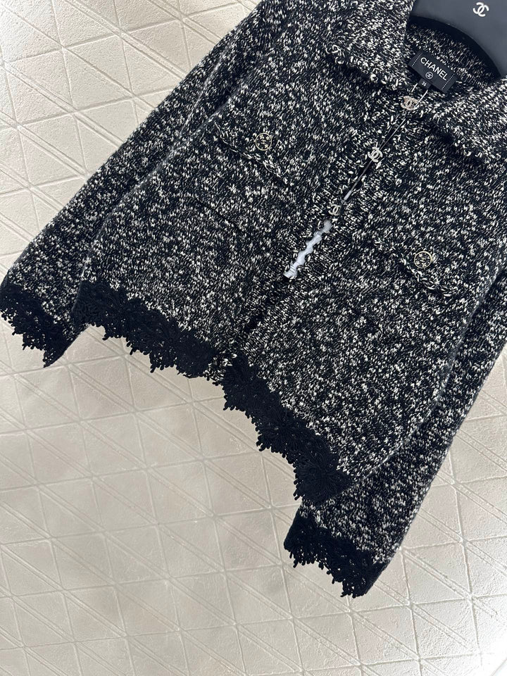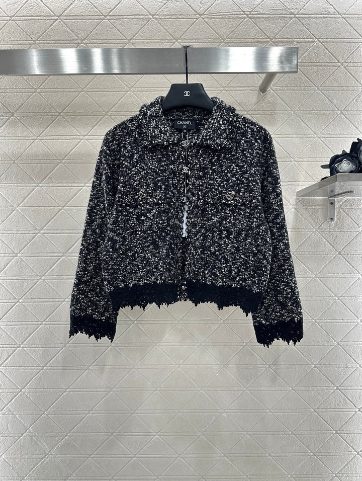 Crafted from custom YB cashmere yarn, this cardigan is comfortable and soft. It features a lapel knit cardigan silhouette with a rhinestone double-C button placket. The collar extends to the front with wavy lace trims, and the cuffs are embroidered with crochet lace. The cuffs feature double-C printed buttons, highlighting the brand's signature. This garment features a fine, dense crochet weave. The solid colorway is accented with polka dots for a durable and gentle look. It exudes a refined, vintage style, adding an elegant touch and a refined, modern aesthetic. Perfect for dating or commuting. Custom fabrics and accessories are included, along with a custom dust bag. Look for the exact version, high-quality. Available in three colors: 36, 38, and 40.