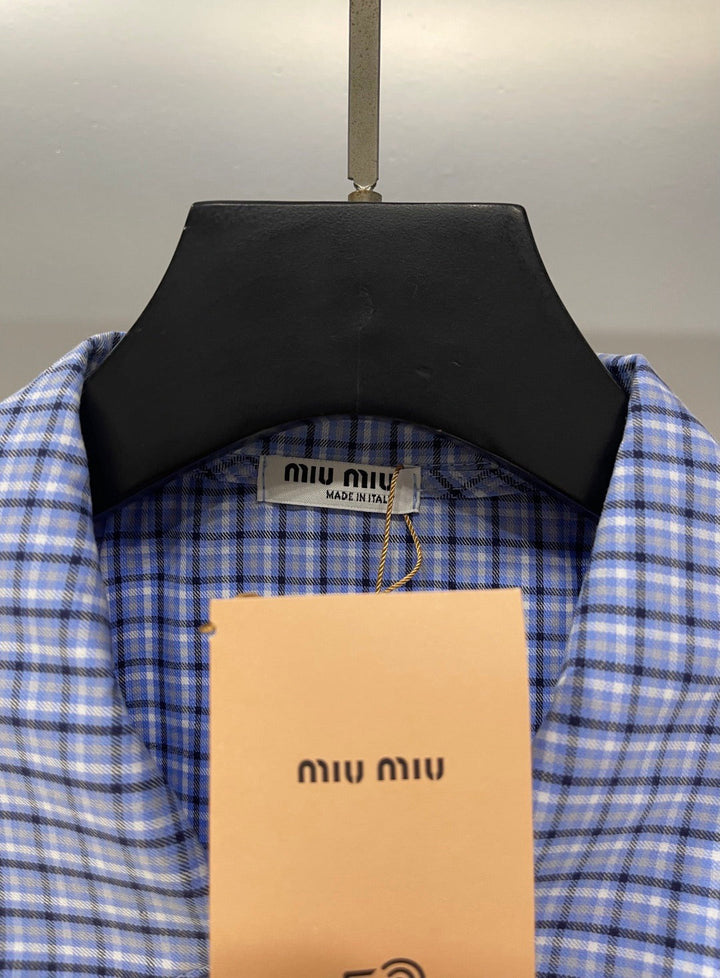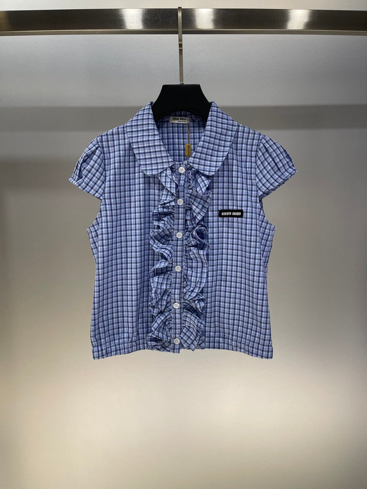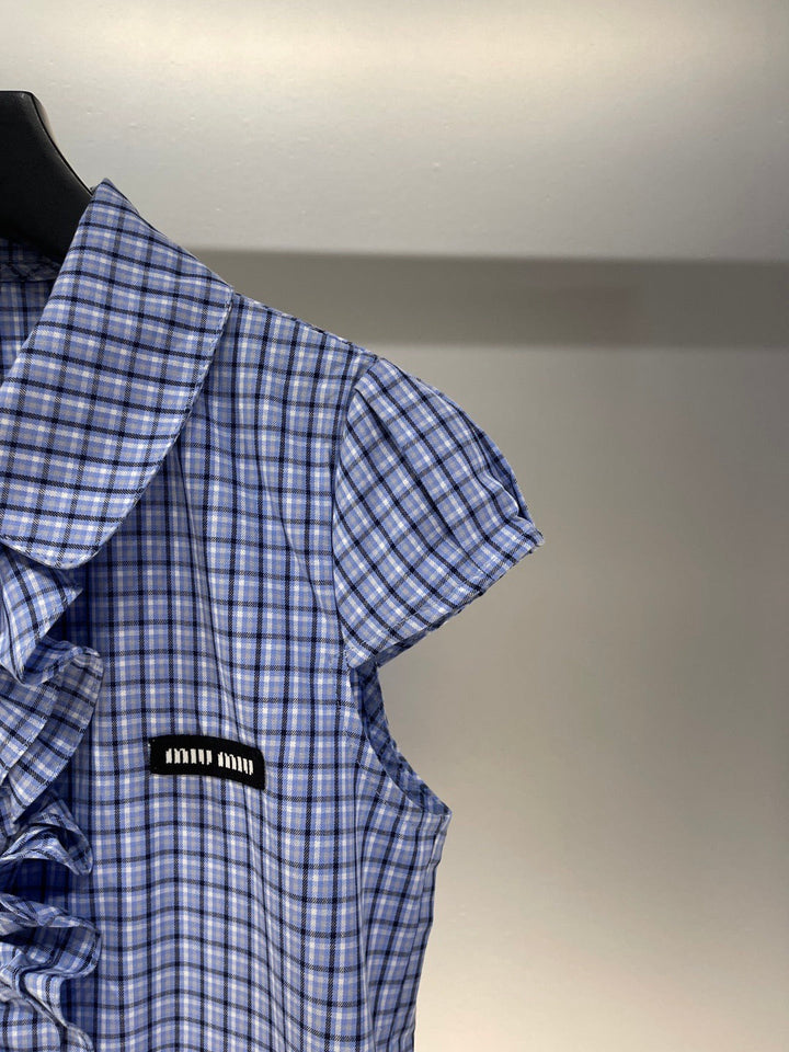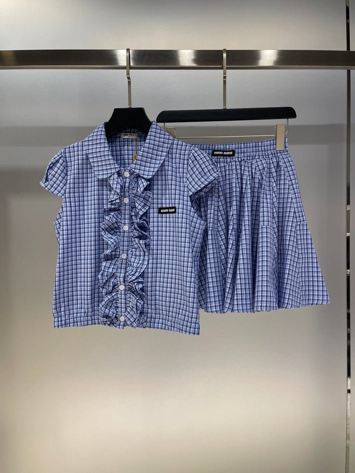 Miu Letter Embroidery Patch Denim Skirt with Ruffled Hem & Elastic Waist