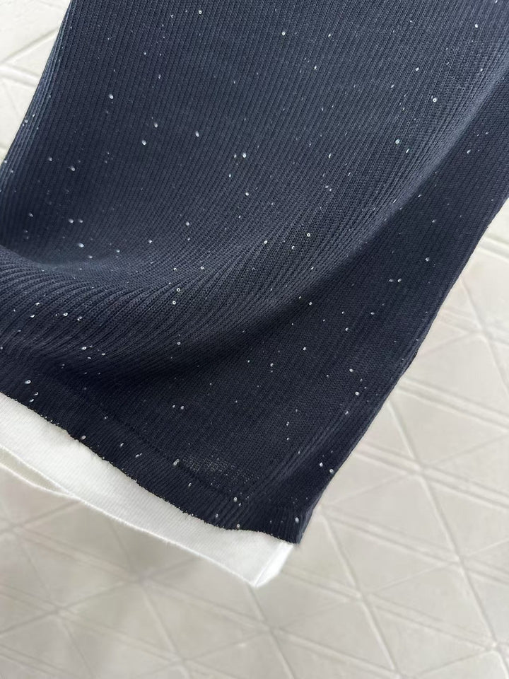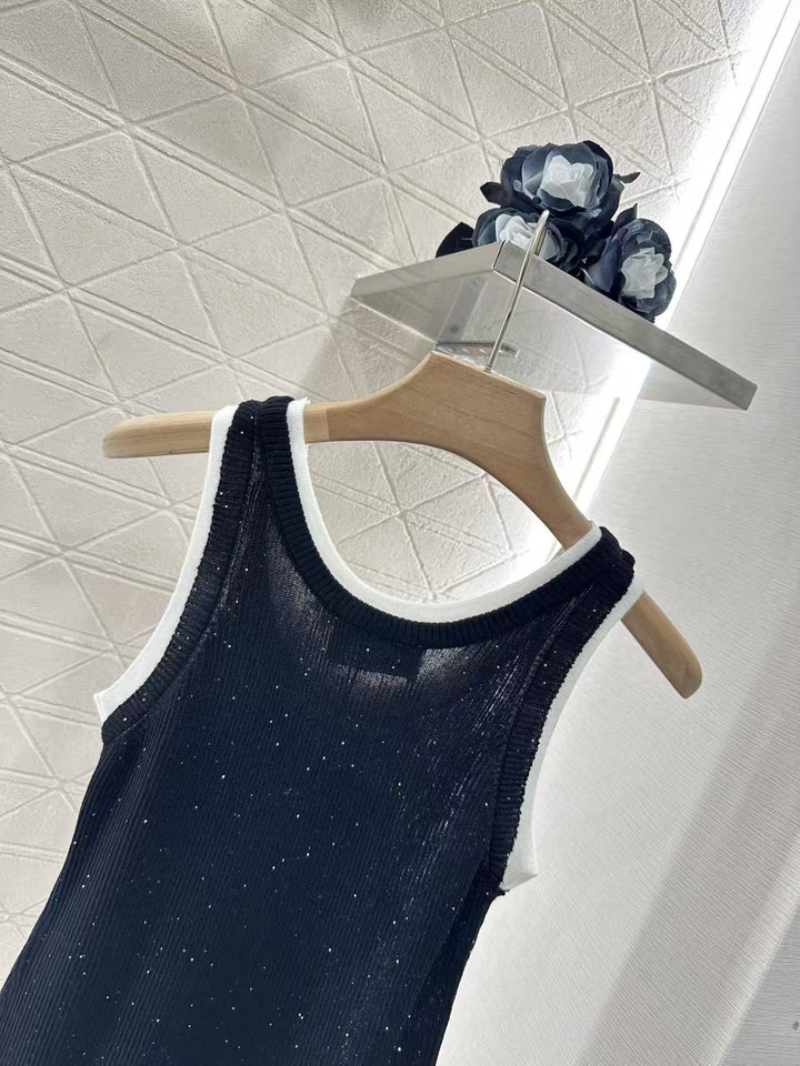 , high-quality and comfortable texture Fake two-piece vest cut Contrast color hemming reveals a layered effect Available in black and white Black body adds white irregular beads to embellish the chest with a signature metal triangle logo pattern Highlight the brand personality Highlight the high-end sense of wear Vertical pit texture slimming design Make simple styles look sexy and individual Elasticity makes it more refined Wearing shows a relaxed tone Light luxury and fashionable temperament Can be worn alone or layered First choice for fashionable wear in all seasons