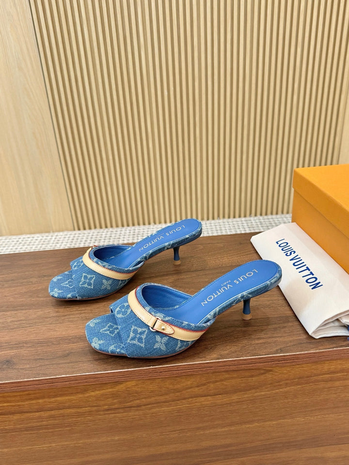 These denim mule heels shatter the divide between street and couture — rugged blue denim, etched with iconic monograms, meets a sculpted kitten heel, while a buttercream leather strap (trimmed in crimson, cinched by a gilded buckle) crashes into the canvas like a modern revolt. It’s a symphony of raw rebellion, heritage reverence, and feminine poise, redefining the language of luxury footwear.
