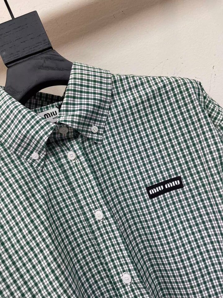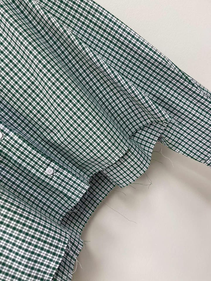 Green Check Lapel Cropped Long Sleeve Shirt