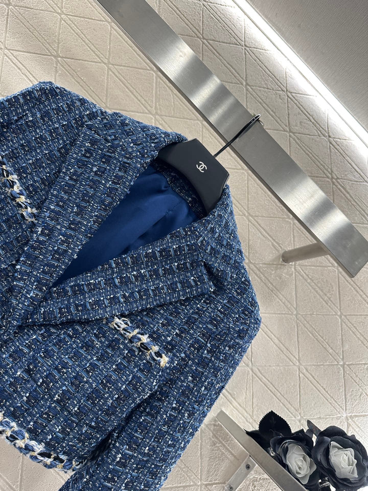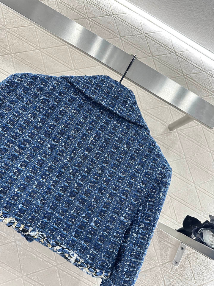 New Fall/Winter 25 collection: Heavy-Duty Cropped Dress Jacket. Custom-made YB imported wool tweed for a premium, refined look. The padded shoulder dress cut features a cropped silhouette that reveals the waist, enhancing the figure's slenderness. The chest pockets, cuffs, and hem are embellished with 3D contrasting braided binding. The front placket is embellished with shimmering, engraved round buttons. The delicate plaid weave creates a full-body, all-over look, creating a sophisticated, elegant, and effortless look. Custom fabrics and trims are available. Look for the high-quality version. Available in 1 color, S, M, and 3 sizes.