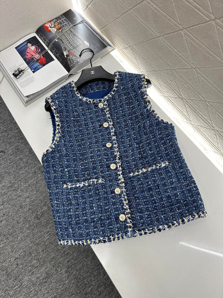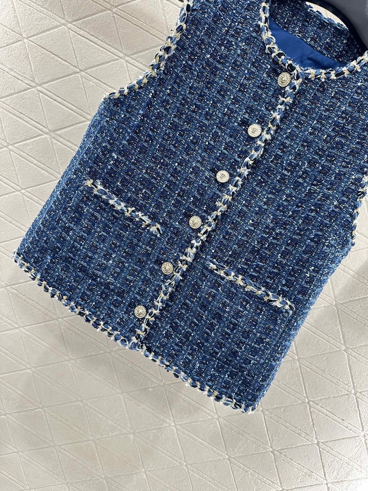 Customized YB imported wool tweed fabric. The texture is visible, and the wool is premium. This coarse, floral-striped tweed fabric embodies a sophisticated, ladylike style. The single row of printed buttons on the front and the exquisite navy blue woven texture create a luxurious yet elegant look. Gold-thread trimming throughout, including at the cuffs and front, creates an elegant and layered design. A top choice for the fashionable and sophisticated. Custom fabrics and accessories. Look for the high-end version, 36, 38, 40.