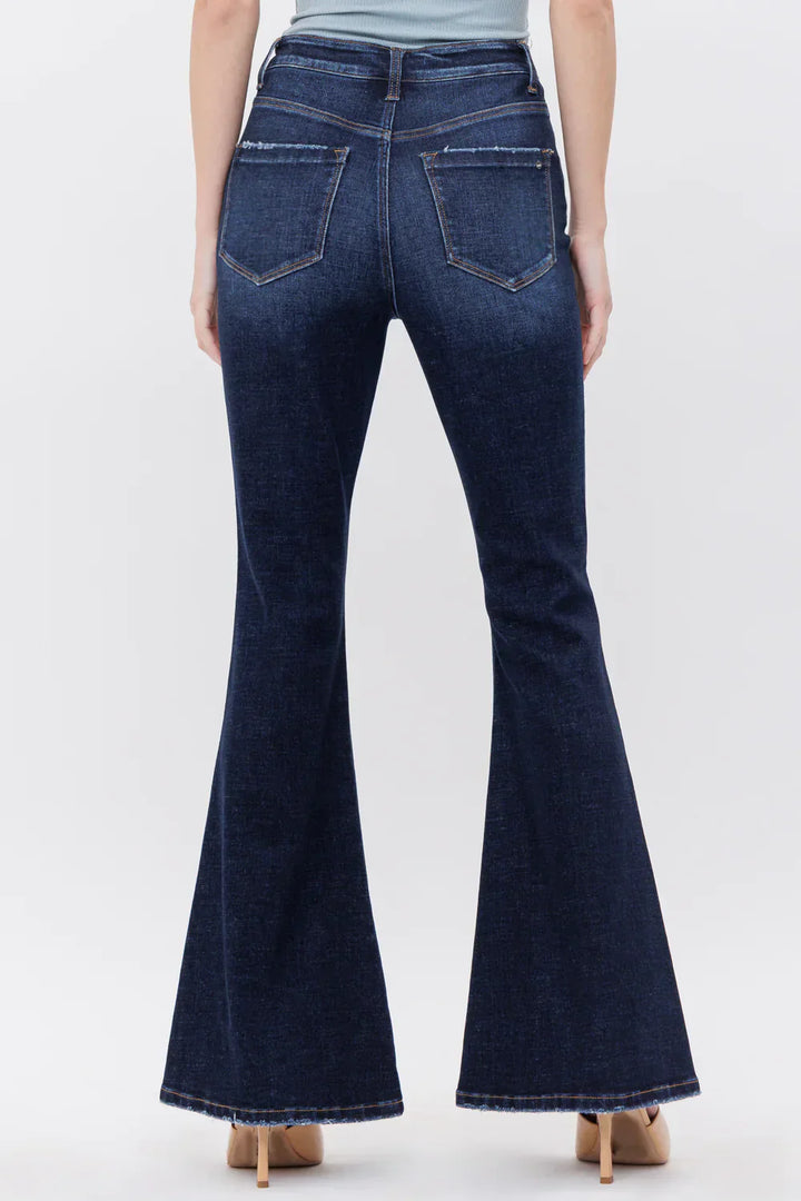 High Rise Distressed Denim Jeans. Flare bottoms with great stretch and super luxurious feel. Real pockets in back and front super figure flattering and the high-rise fit gives great tummy control.
